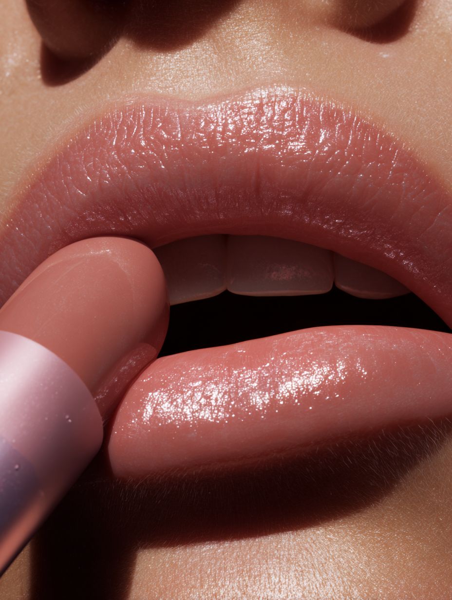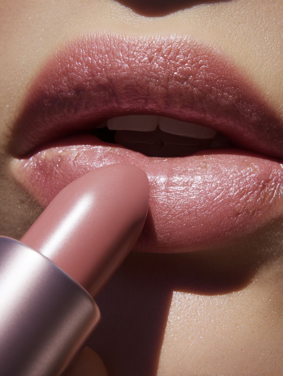 Uma foto de beleza em close-up extremo e hiperrrealista dos lábios femininos durante o processo de aplicação de batom. A imagem captura um momento estático: o bastão de batom toca suavemente o lábio inferior, como se estivesse no meio da aplicação, mas não há movimento visível ocorrendo. Os lábios são macios e ligeiramente abertos, com uma textura brilhante, refletindo sutis destaques especulares da luz solar natural direta. O batom é de um tom rosa suave e natural com um acabamento acetinado, criando um sutil contraste com o tom natural dos lábios. O ponto de contato entre o batom e os lábios mostra uma textura realista, detalhes da pele finos, micro dobras e um brilho natural sem excesso de suavização. A iluminação é forte, com luz solar do meio-dia do mundo real, criando micro reflexos na superfície dos lábios e no bastão de batom. Os lábios têm uma textura hiperrrealista: poros visíveis em torno da área dos lábios, brilho natural da pele e uma aparência ligeiramente úmida, como se tivessem sido hidratados antes da aplicação. A correção de cor usa um tonificação sutil: destaques em bronze quente e rosa nos lábios e no batom, com tons frios nas zonas de sombra (bordas internas dos lábios, cantos da boca). O fundo está completamente desfocado, focando exclusivamente nos lábios e no contato do batom. A configuração da câmera simula a fotografia de beleza macro real: lente macro equivalente a 100 mm, abertura f/8 para detalhes nítidos nos lábios e no batom, ISO 100, velocidade do obturador rápida o suficiente para congelar micro detalhes (1/800). O pós-processamento inclui um leve grão de filme para realismo de textura, sem vinhetas, sem aberrações cromáticas, sem brilho, e alta clareza para enfatizar a qualidade tátil e real da pele na foto.
