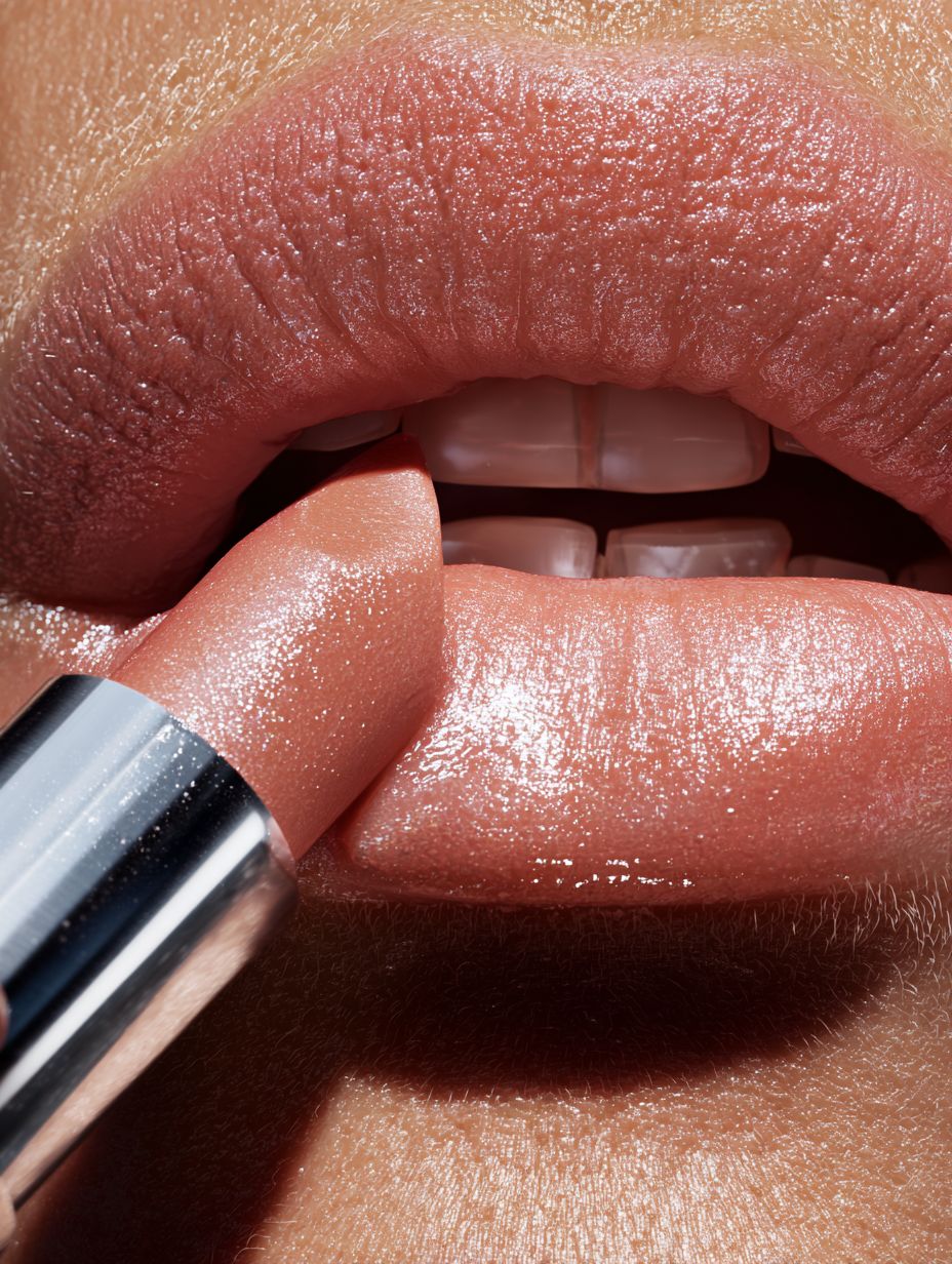 A hyperrealistic extreme close-up beauty shot of female lips in the process of applying lipstick. The image captures a static moment: the lipstick bullet gently touches the bottom lip, as if mid-application, but no visible motion is occurring. The lips are soft and slightly parted, with a glossy texture, reflecting subtle specular highlights from direct natural sunlight. The lipstick is a soft, natural pink shade with a satin finish, creating a subtle contrast with the lips' natural tone. The contact point between the lipstick and the lips shows a realistic texture fine skin details, micro folds, and natural gloss without over-smoothing. Lighting is harsh, real-world midday sunlight, creating micro reflections on the lip surface and the lipstick bullet. The lips have a hyperreal texture: visible pores around the lip area, natural skin sheen, and a slightly humid look, as if just moisturized before application. Color grading uses subtle split toning: warm bronze and pinkish highlights on the lips and lipstick, with cool undertones in the shadow zones (inner lip edges, corners of the mouth). The background is completely blurred, focusing solely on the lips and lipstick contact. Camera setup simulates real macro beauty photography: 100mm macro lens equivalent, aperture f/8 for sharp detail across the lips and lipstick, ISO 100, shutter speed fast enough to freeze micro detail (1/800). Post-processing includes slight film grain for texture realism, no vignette, no chromatic aberration, no bloom, and high clarity to emphasize the tactile, real-skin quality of the shot. --ar 3:4 --raw --profile yiftj8c --stylize 0 --v 7.0