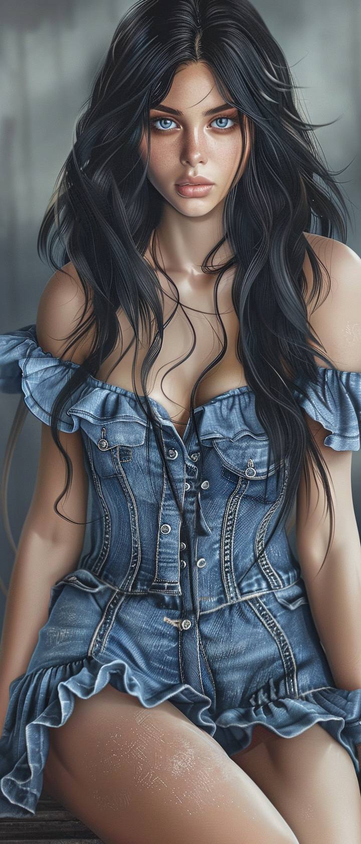 A beautiful woman, a fashion model, with deep facial features and a great figure, showing shoulders and thighs, wearing a denim dress with ruffled edges, long black hair, real, surreal, finely detailed facial features.--sref 734185926 --ar 3:7 --v 6.0