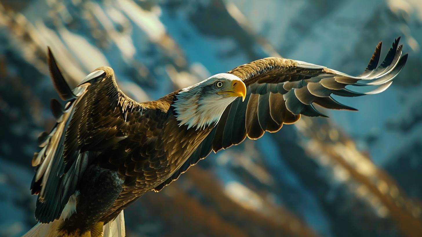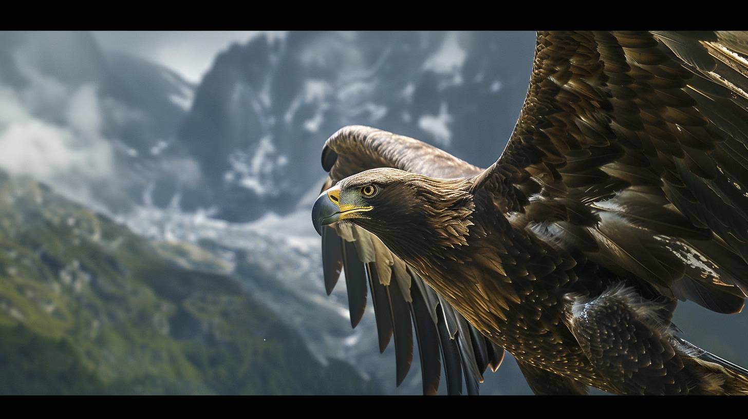 Close-up Eagle in flight with wings spread, piercing eyes, sharp talons, mountainous region, dramatic lighting, cinematic photography style, high-resolution film camera, --ar 16:9 --v 6.0