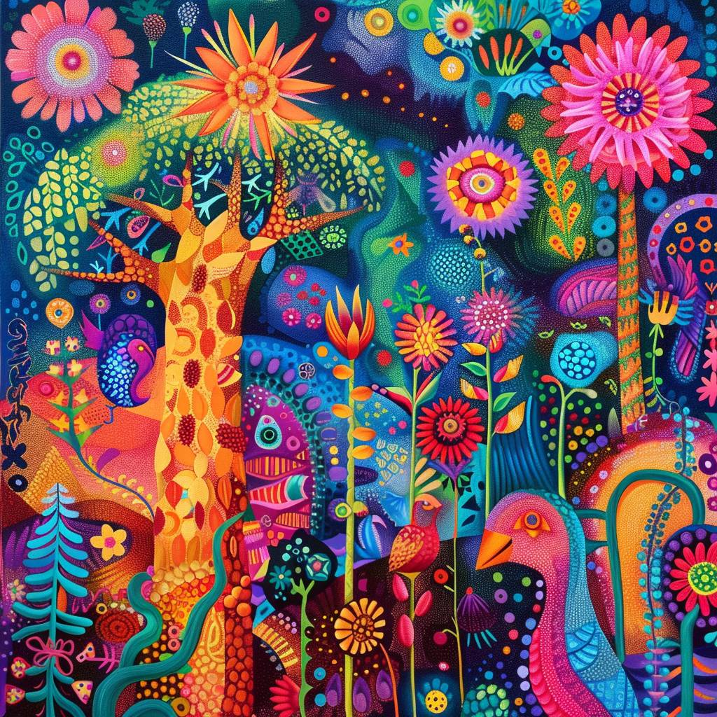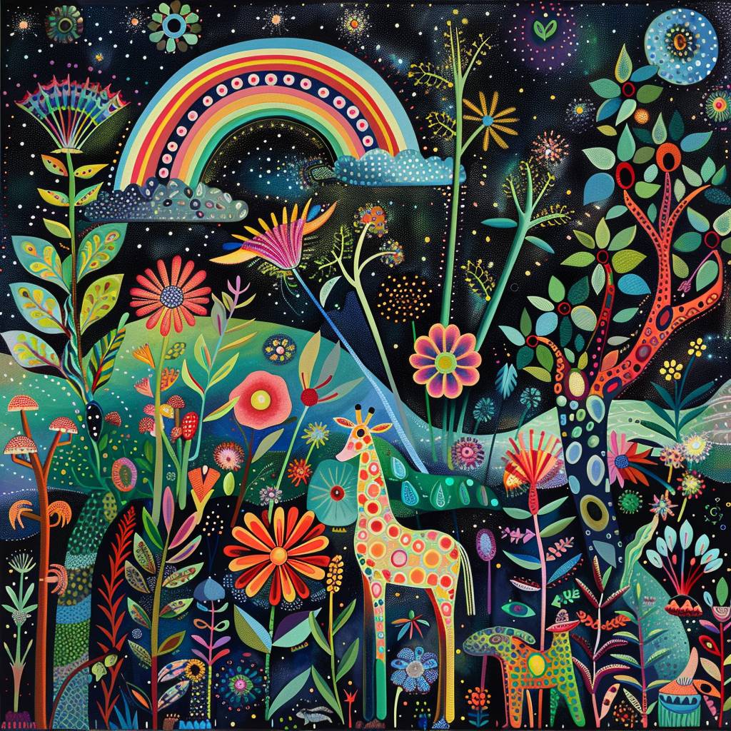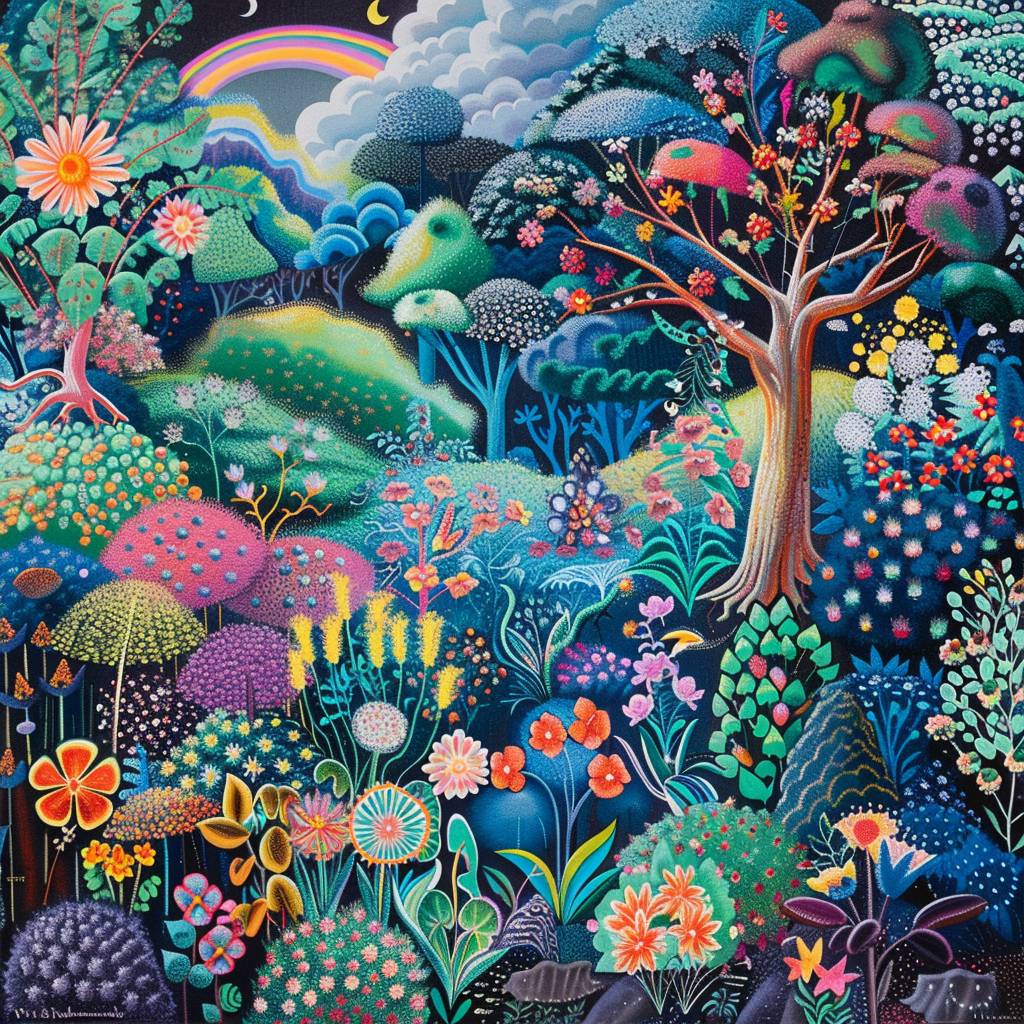 Um jardim encantado com flores, árvores e animais compostos de padrões geométricos brilhantes. As plantas e criaturas têm uma aparência 3D, dando profundidade ao jardim, um céu padrão com um arco-íris.