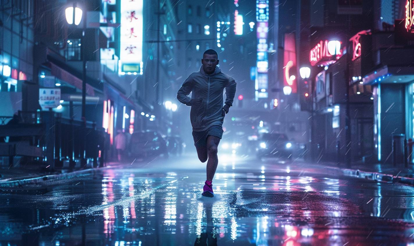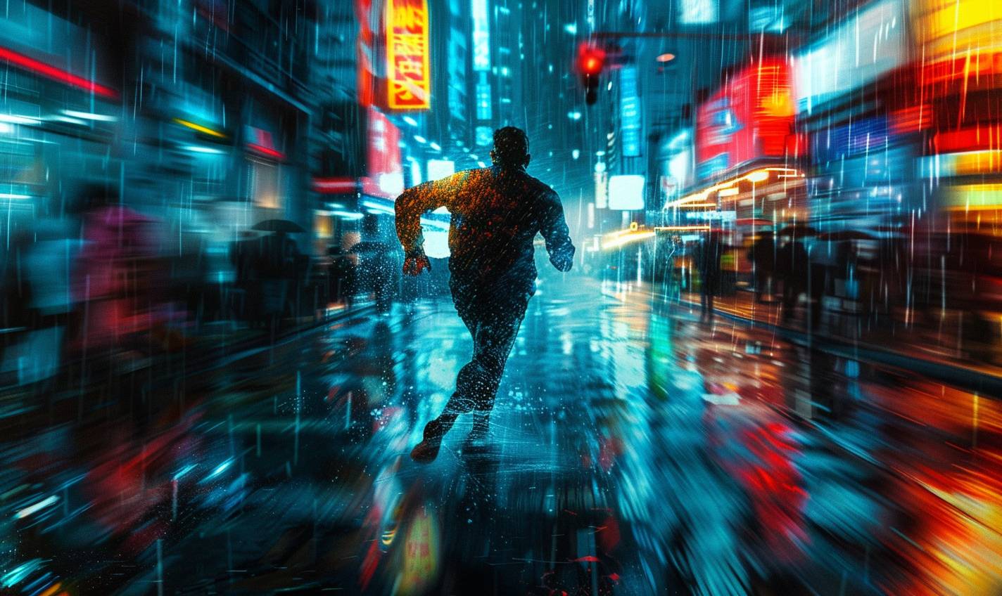 Um homem correndo por uma rua molhada da cidade à noite, iluminado por luzes de néon refletidas no pavimento molhado, com uma expressão intensa de determinação.