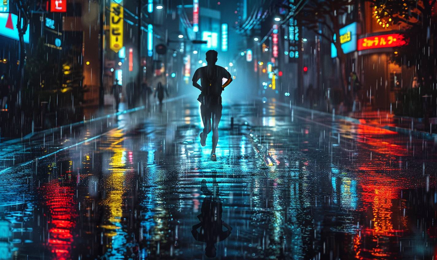 Um homem correndo por uma rua da cidade encharcada de chuva à noite, iluminado por luzes de neon refletidas no pavimento molhado, com uma intensa expressão de determinação.