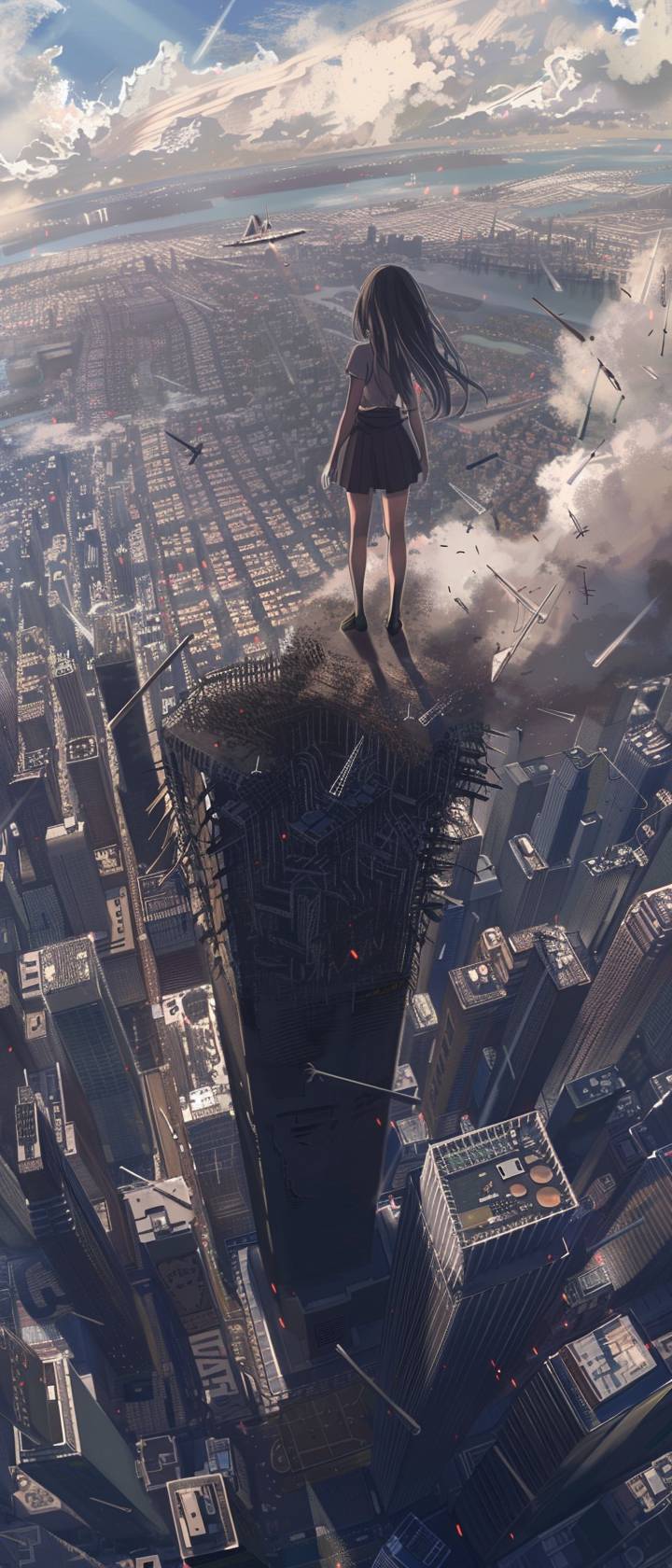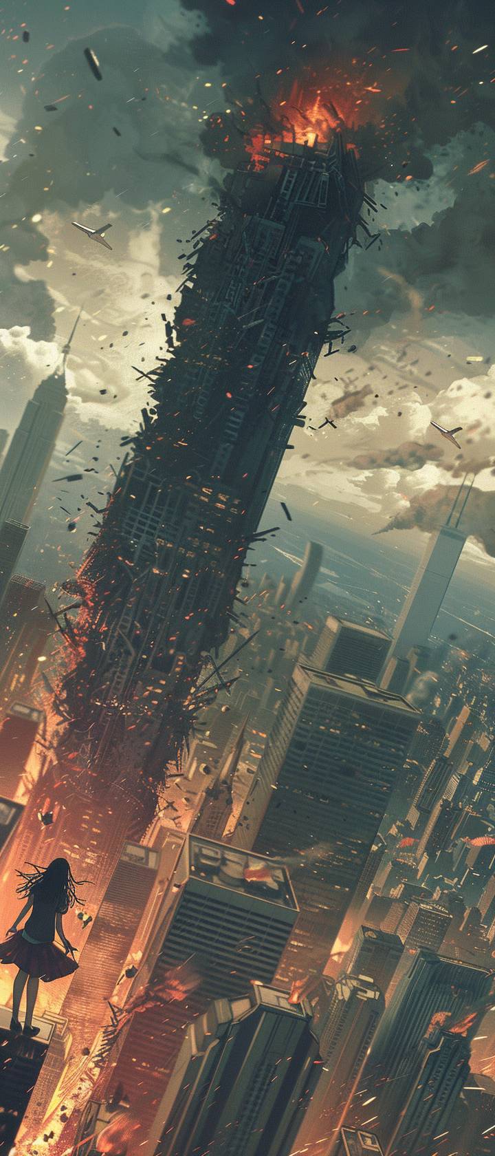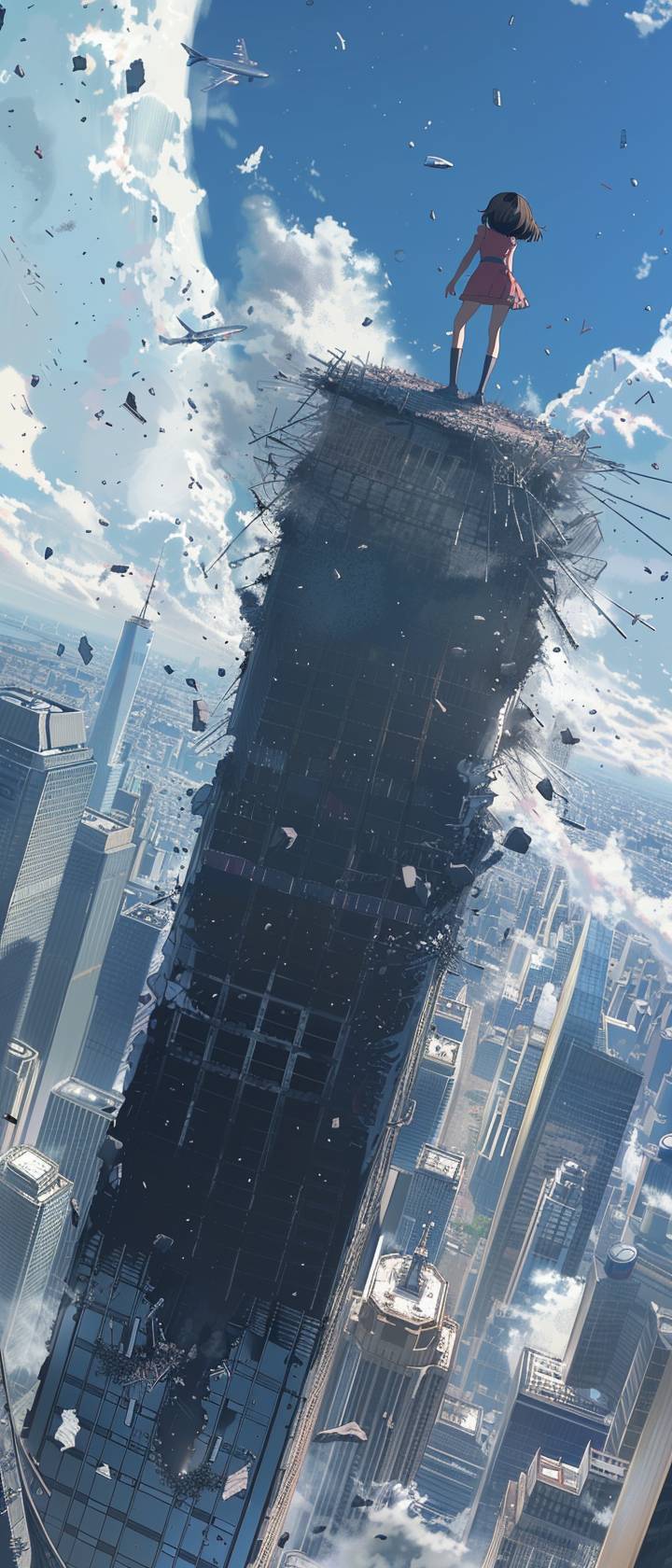 An anime girl standing on top of the World Trade Center North Tower as it crumbles to the ground after getting hit by a plane. --ar 3:7 --v 6.0