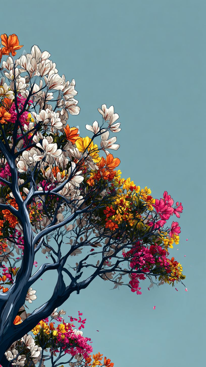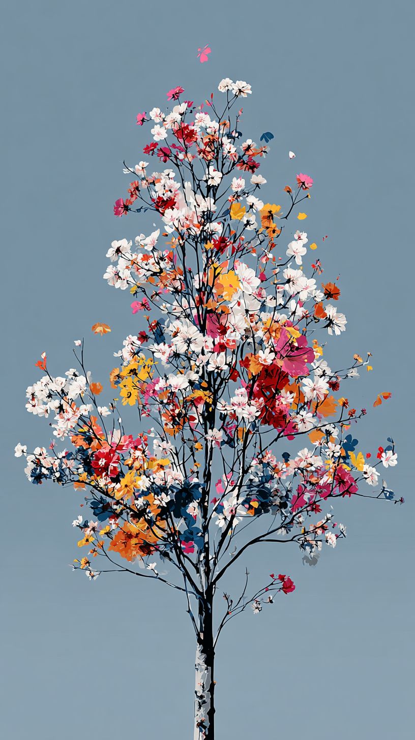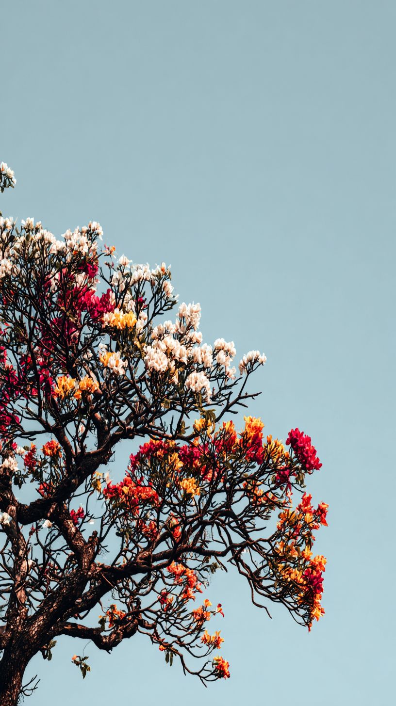 A tall, blooming tree against a clear, pale-blue sky, creating a vibrant contrast. The tree's branches are a network of gray and brown lines, adorned with a multitude of colorful flowers. These flowers are in full bloom, showcasing a variety of hues, including white, red, pink, yellow, and orange, adding splashes of color throughout the composition. The flowers' delicate petals are rendered in fine detail, emphasizing their soft texture. The tree's overall form is symmetrical, with its branches spreading out in a balanced manner. The sky takes up the upper portion of the frame, providing an airy backdrop. Lighting is soft and diffused, enhancing the delicate details of the flowers and the texture of the tree's bark. The composition is simple, emphasizing the beauty of nature. The image evokes a feeling of peace and serenity. The photograph appears to be a close-up shot of a stylized tree, focusing on the intricate details of nature. --ar 9:16 --raw --profile q82l1xo --s 50 --v 7.0