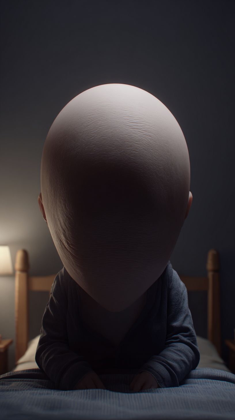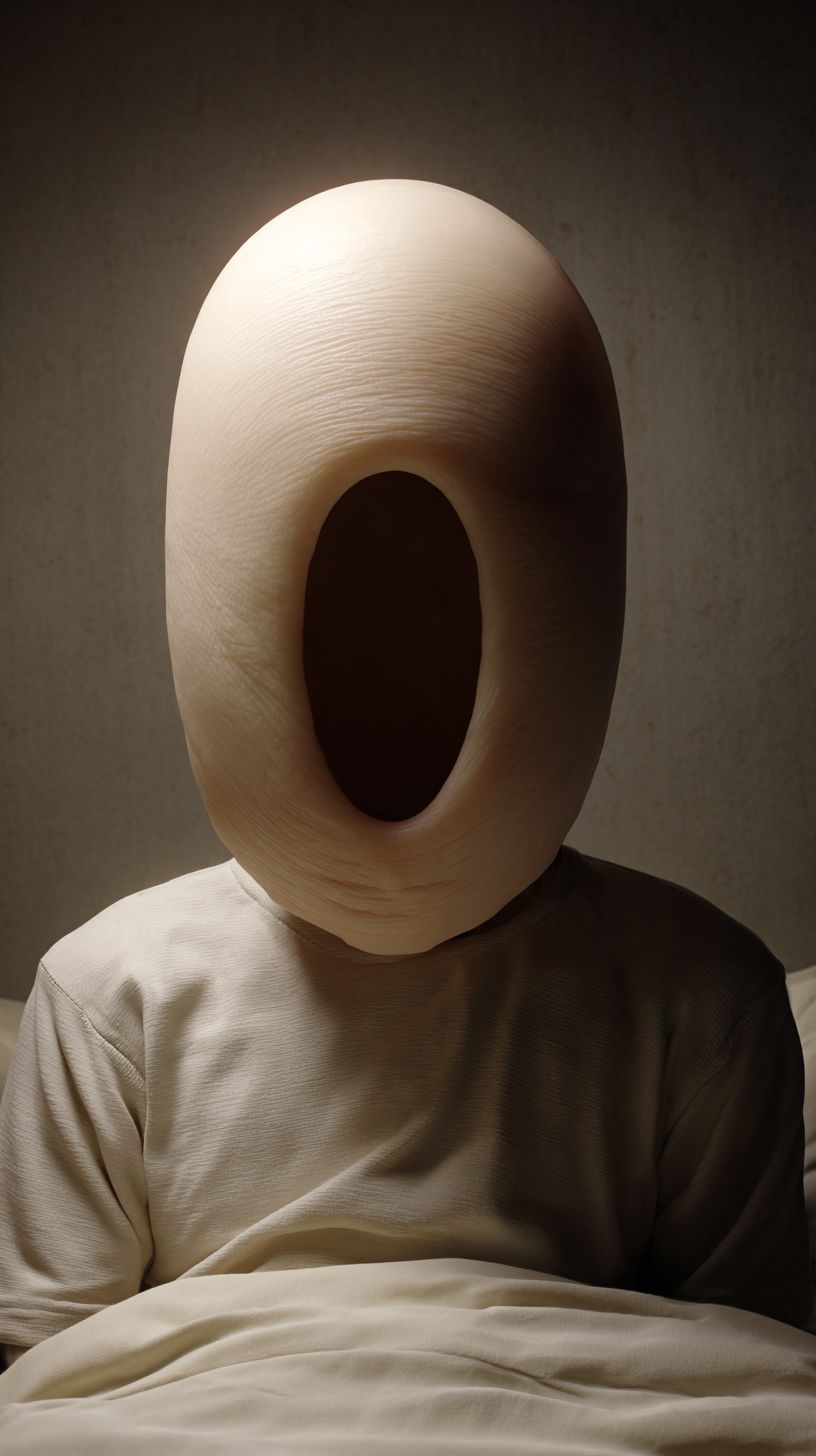 Close-up hiper-realista extremo da cabeça e ombros de um homem sem rosto, sentado na borda de uma cama à noite. Onde seu rosto deveria estar, existe apenas pele pálida, lisa e sem poros esticada sobre um vazio oval sem características — sem olhos, sem nariz, sem boca, apenas uma estranha extensão em branco refletindo uma fraca luz da lua. Um colar de pijama cinza amassado emoldura a base do pescoço; mechas de cabelo desgrenhado grudam na testa. Uma luz azul-petróleo, fria e tênue, das persianas quebradas esculpe linhas prateadas finas ao longo da pele em branco, aprofundando a ausência oca. Uma paleta dessaturada: cinzas acinzentados, azuis doentes, âmbar quase invisível de uma lâmpada moribunda. Textura de pele ultra-detalhada, micro-peles de galinha, grão de filme sutil, silêncio opressivo, resolução 8K, fotorealista, terror sufocante.