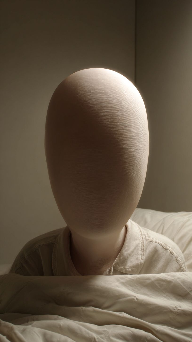 Hyper-realistic extreme close-up of a faceless man’s head and shoulders, seated on the edge of a bed at night. Where his face should be is only smooth, poreless pale skin stretched taut over a featureless oval void --no eyes, no nose, no mouth, just an uncanny blank expanse reflecting faint moonlight. Rumpled gray pajama collar frames the base of the neck; strands of disheveled hair cling to the forehead. Dim, cold teal light from cracked blinds carves razor-thin silver lines across the blank skin, deepening the hollow absence. Desaturated palette: ashen grays, sickly blues, barely-there amber from a dying bulb. Ultra-detailed skin texture, microscopic goosebumps, subtle film grain, oppressive silence, 8K resolution, photorealistic, suffocating dread. --ar 9:16 --profile 6mgy2at --stylize 50 --v 7.0