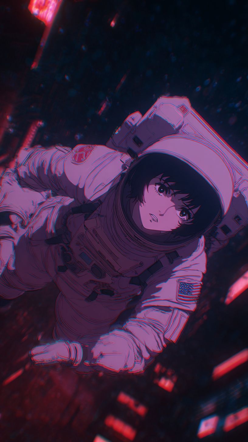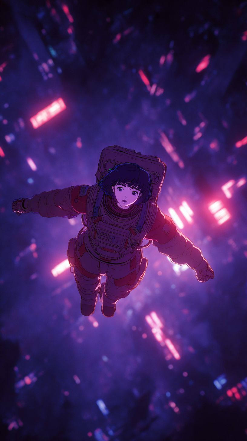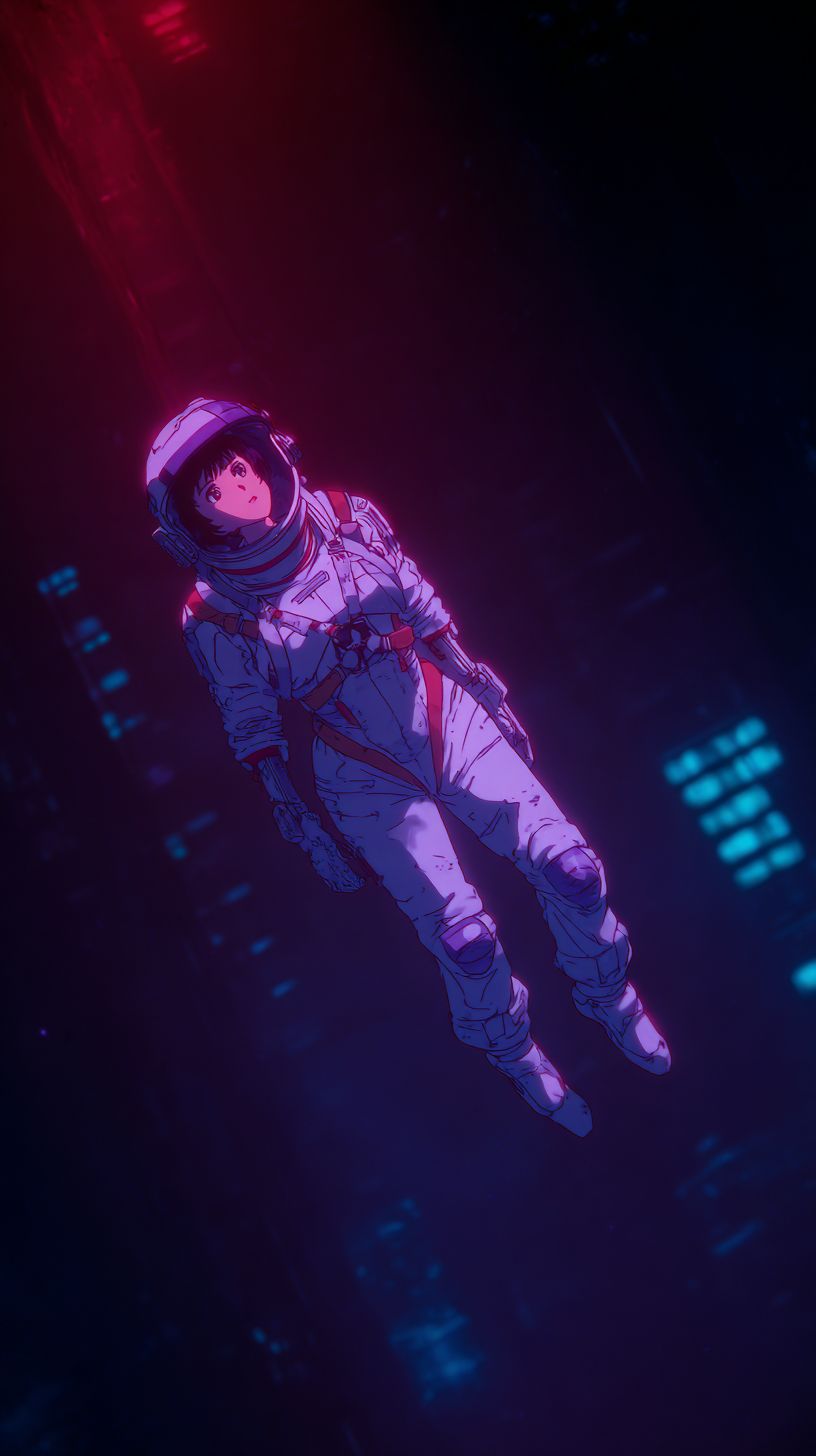 Visual: a girl in a spacesuit floating in the endless void of space. Style: 90s anime cel-shaded style, Ghost in the Shell aesthetic, Akira-style detailing, cinematic blocking, strong lens depth of field, moody atmosphere. purple and red color palette, high contrast, grainy and blurry anime film texture. Dark cyberpunk city lighting, glowing neon reflections. Old 80s/90s anime manga illustration style, not modern, not realistic. Cinematic anime framing, dramatic shadows, filmic lenses and focus. soft grain, classic 80s lightning. --ar 9:16