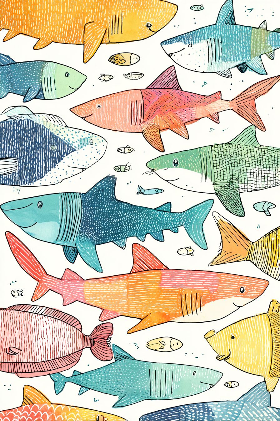 a group of whimsical sharks illustrated in a children's style, including hammersharks, sharks, baby sharks, and fish, each with naturally shaped bodies decorated with colorful, patterned textures (not clothing), hand-drawn naive art, bold outlines, playful shapes, mid-century modern and Scandinavian influence, flat textured colors, white background, child-friendly aesthetic --ar 2:3 --raw --profile v1fqddp --v 7.0