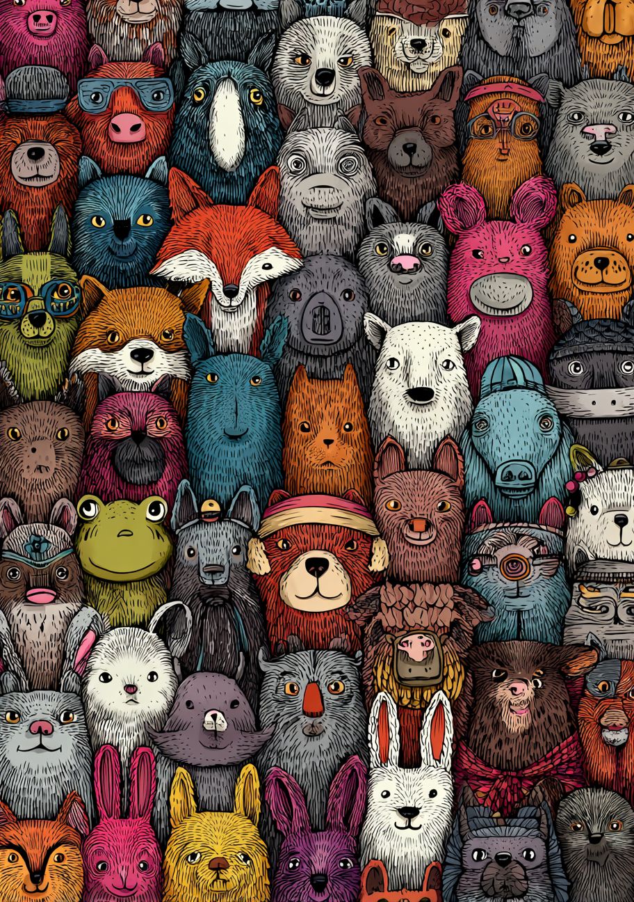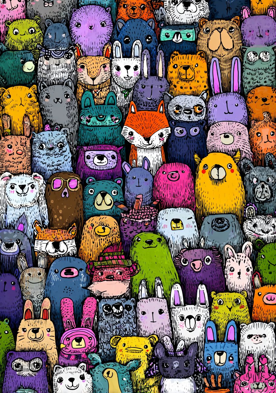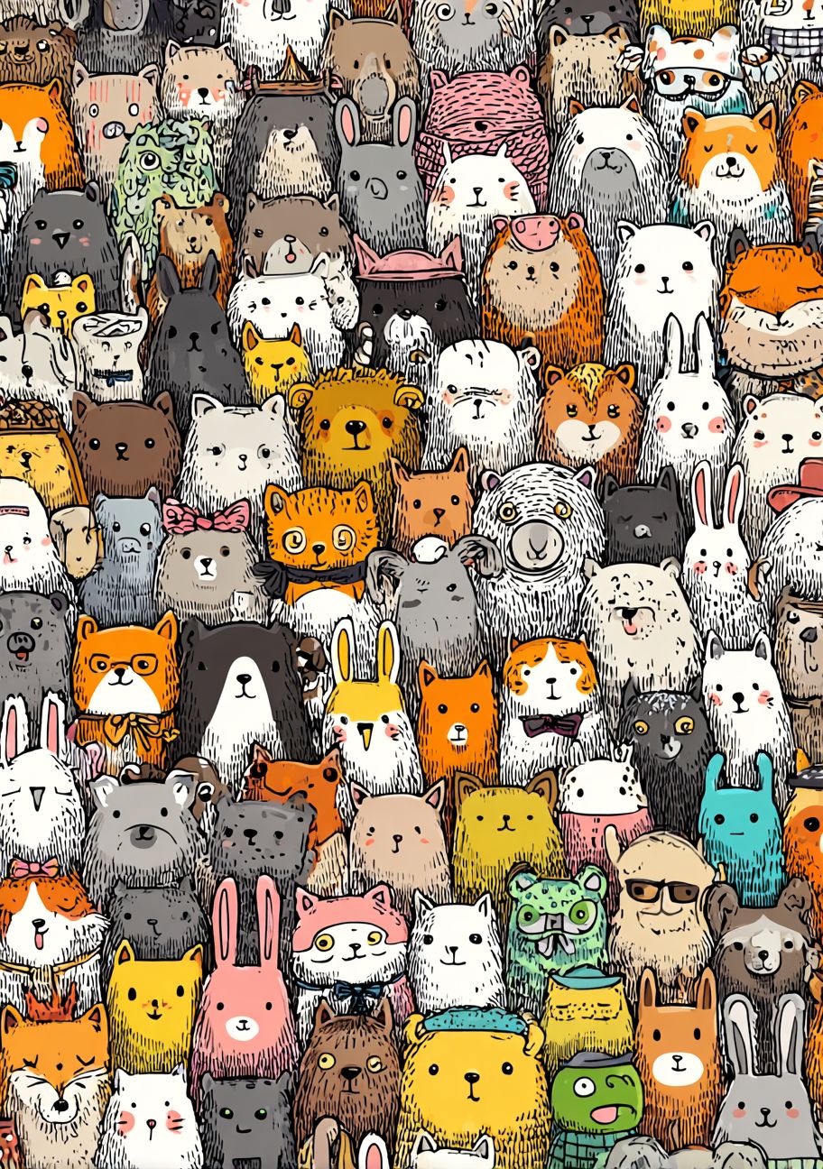 Arte de rabiscos em cores vibrantes, uma multidão densa de faces de animais diversos, incluindo gatos, cães, coelhos, raposas, ursos, pássaros, corujas, rãs, cavalos e outras criaturas fofas. Cada um com características únicas, como formas variadas de orelhas, focinhos, padrões de pelagem, penas e olhos expressivos, além de acessórios divertidos como óculos, laços, colares, lenços e chapéus. Design de personagem de cartoon, altamente detalhado, com contornos pretos em um fundo claro.