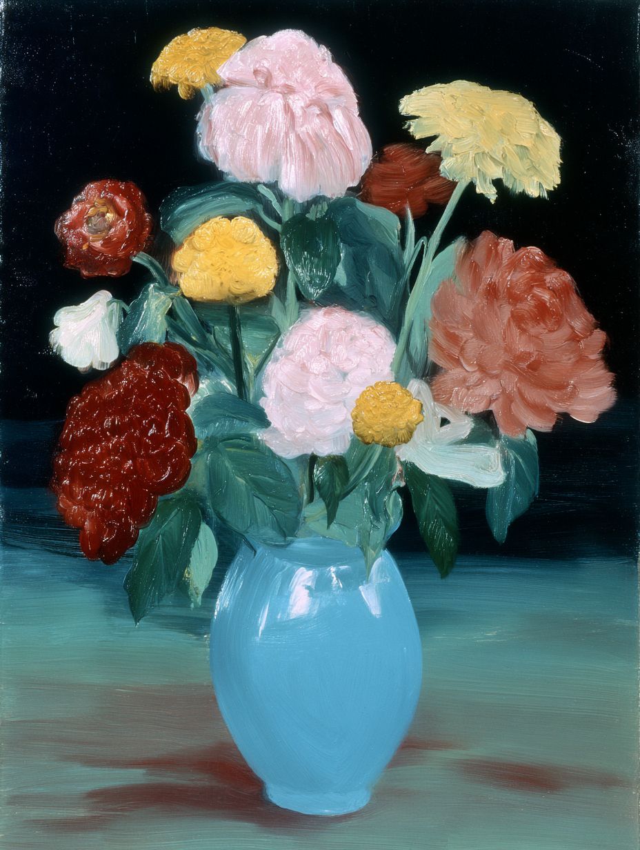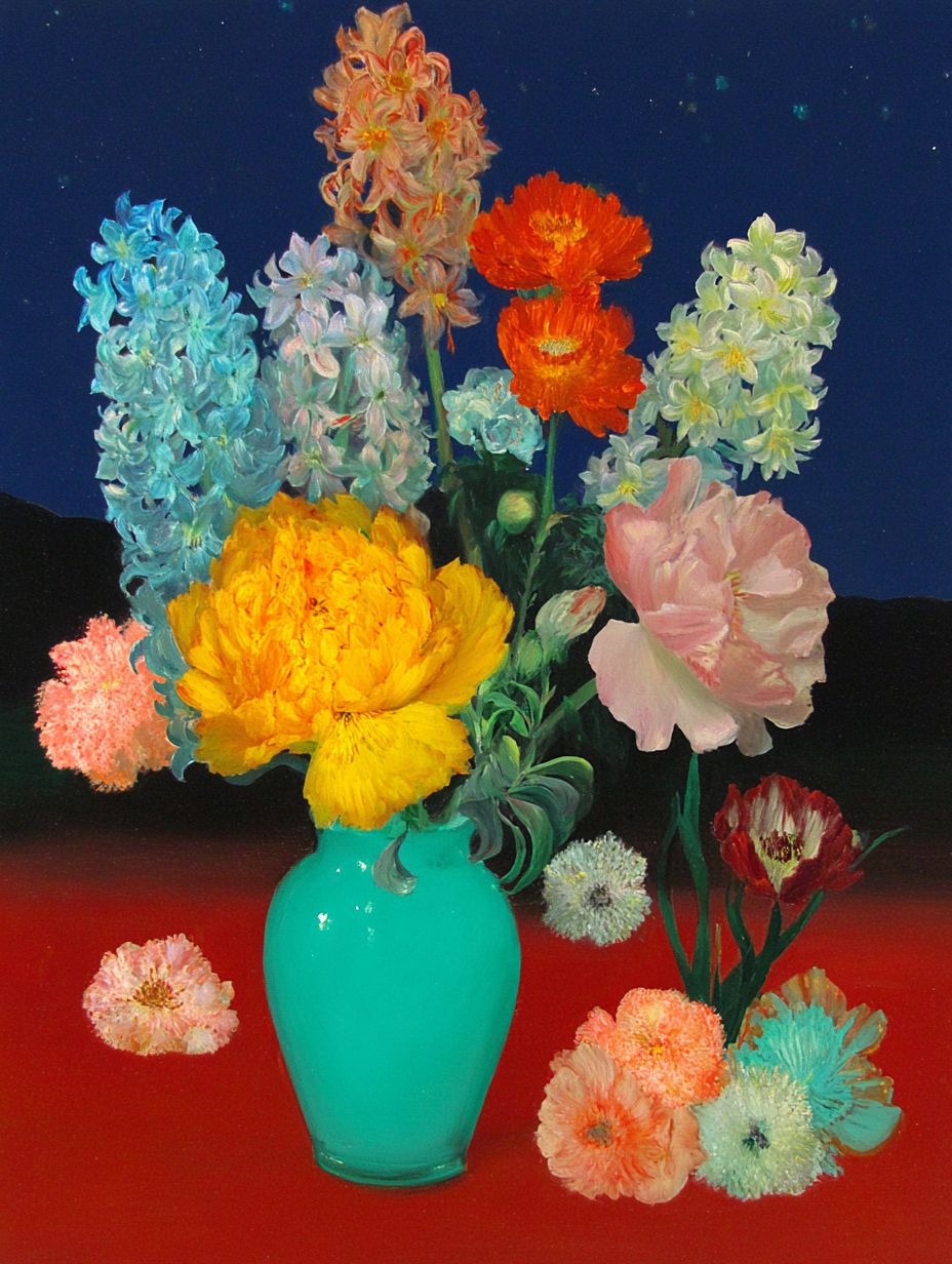painting of a still-life arrangement of flowers at night, painted by Rachel Ruysch and Philip Guston, flash-photo aesthetic, ominous and unsettling, plain dark background --ar 3:4 --profile 1vnycu3 --v 7.0