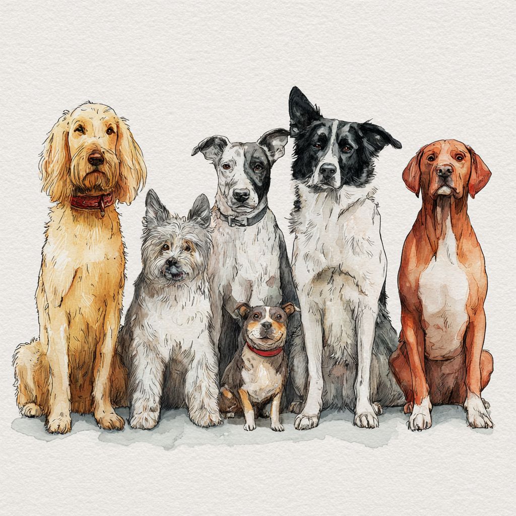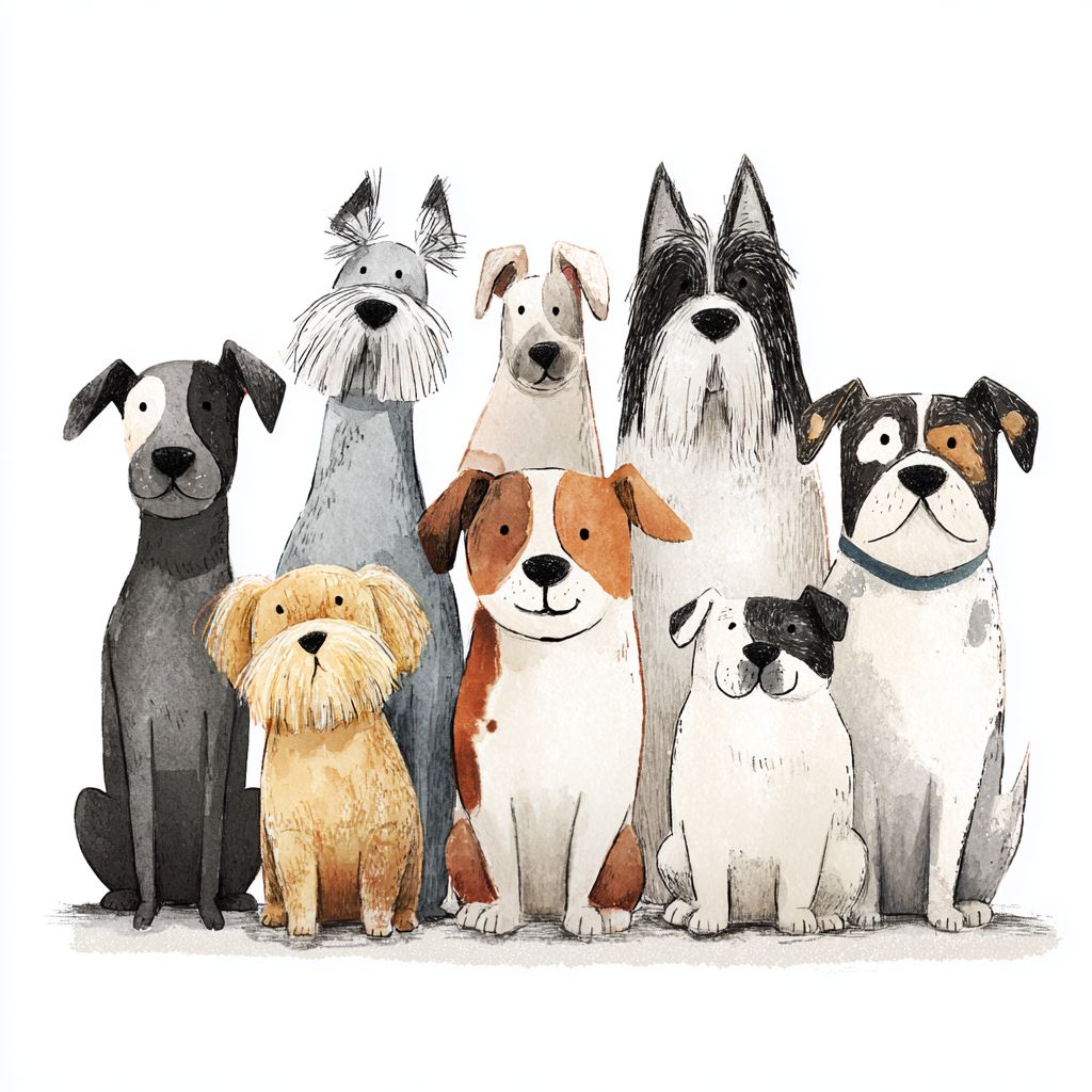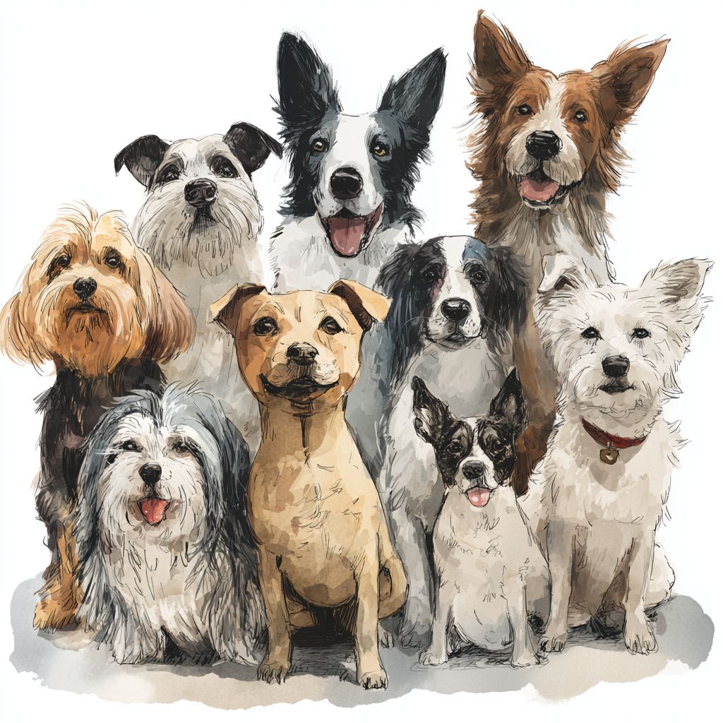 Coleção fofa de cães desenhados à mão de diferentes raças, em pé juntos, olhando para a frente