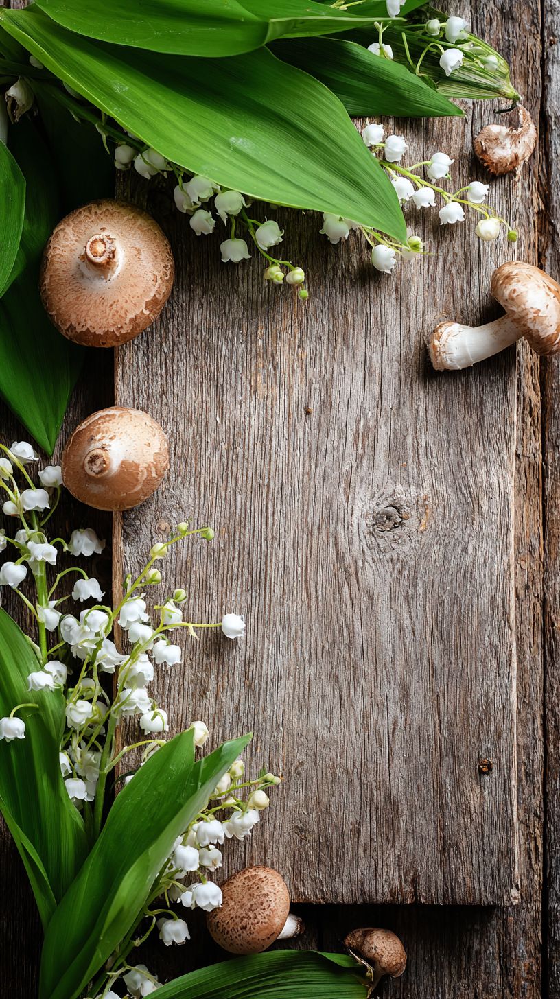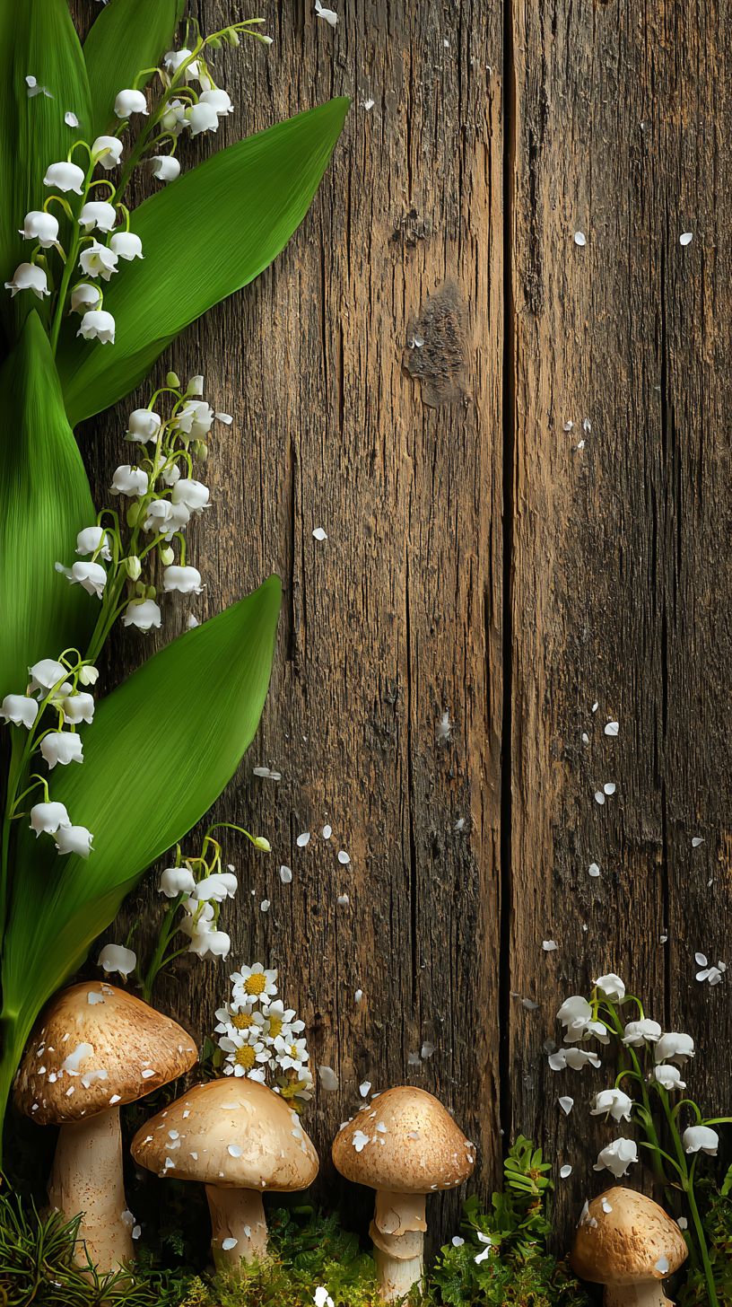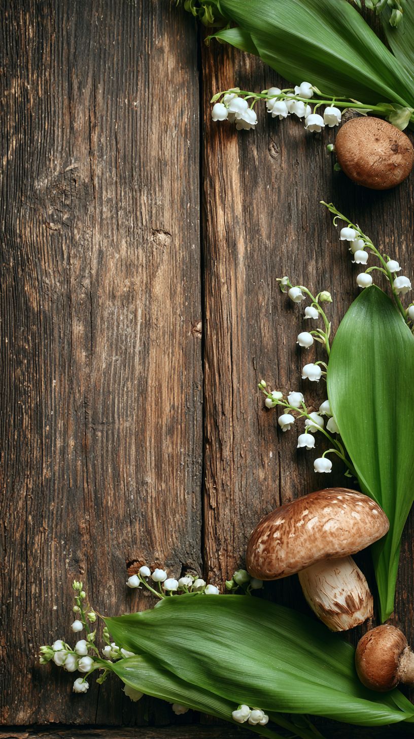 Vertical rustic wood board with empty space, Lily of the Valleyฃ, cute mushrooms on the side, bright lively garden atmosphere --ar 9:16 --raw