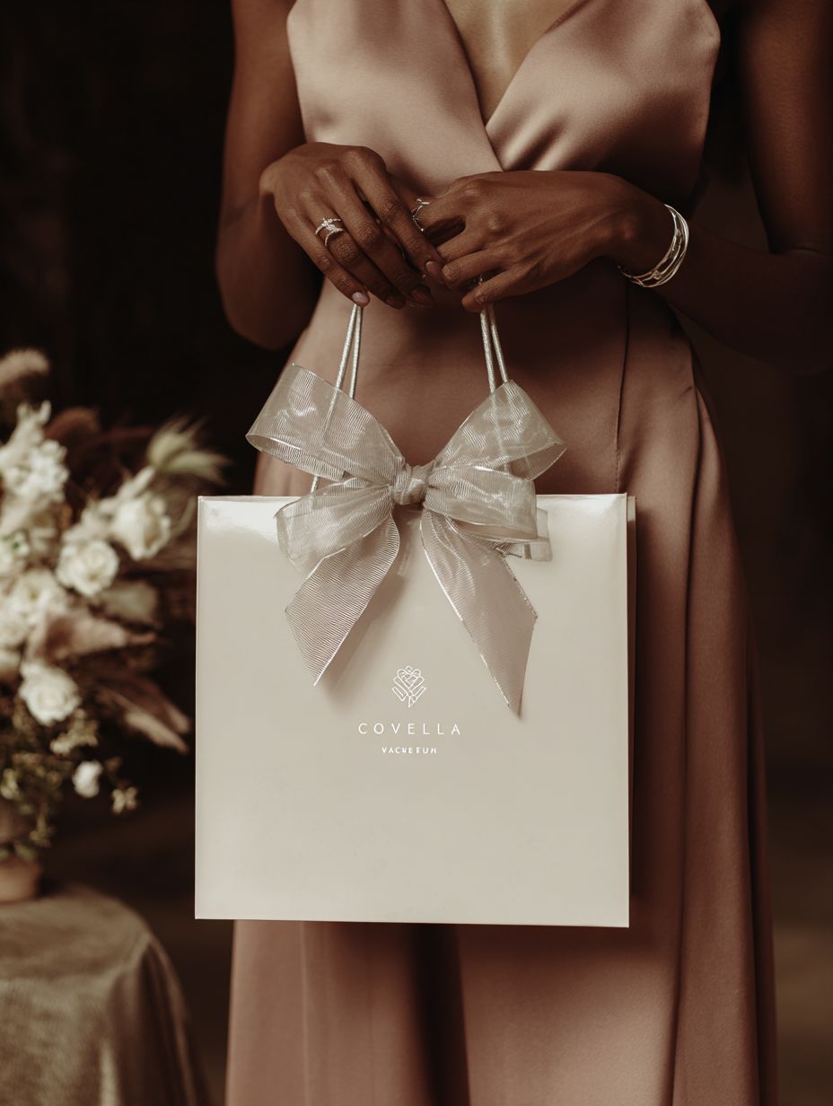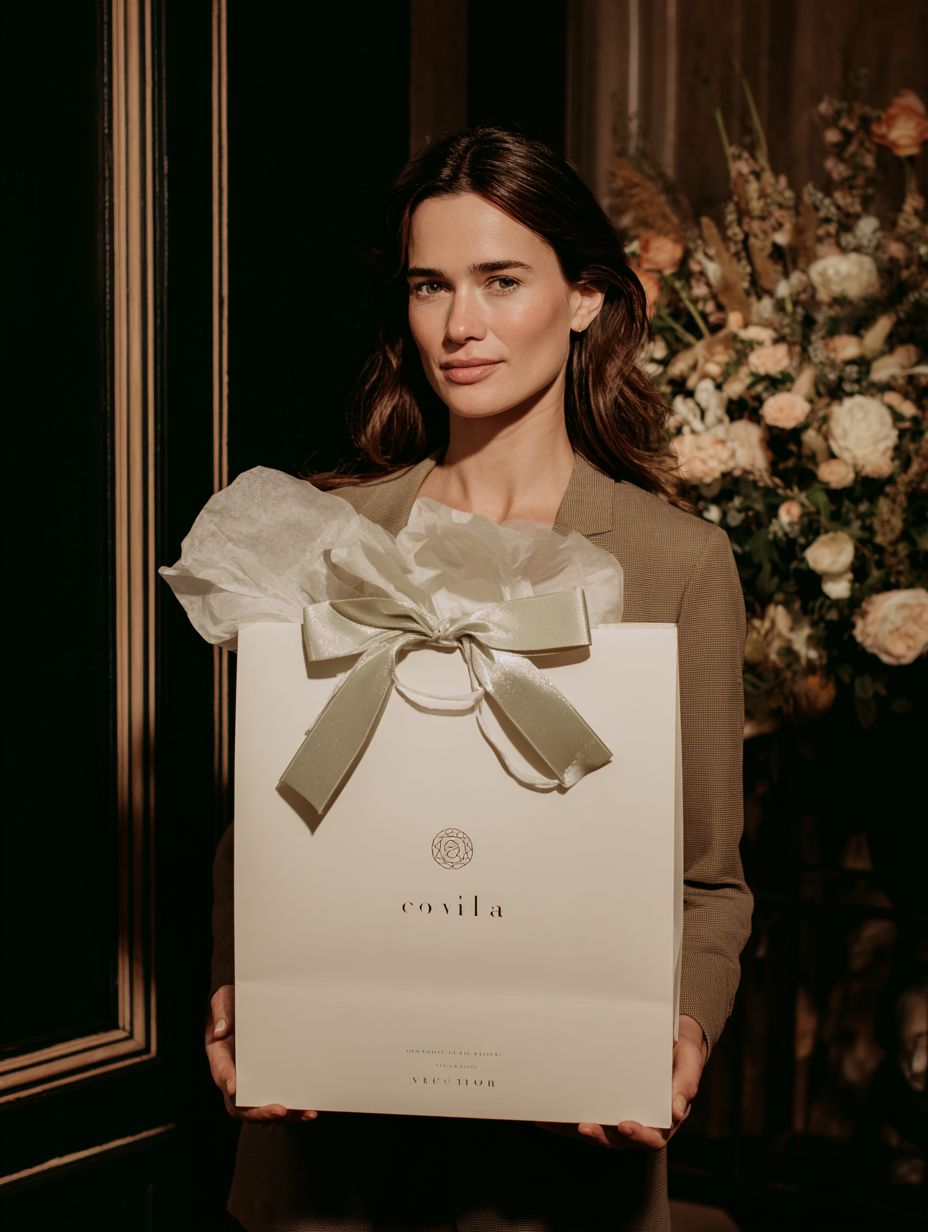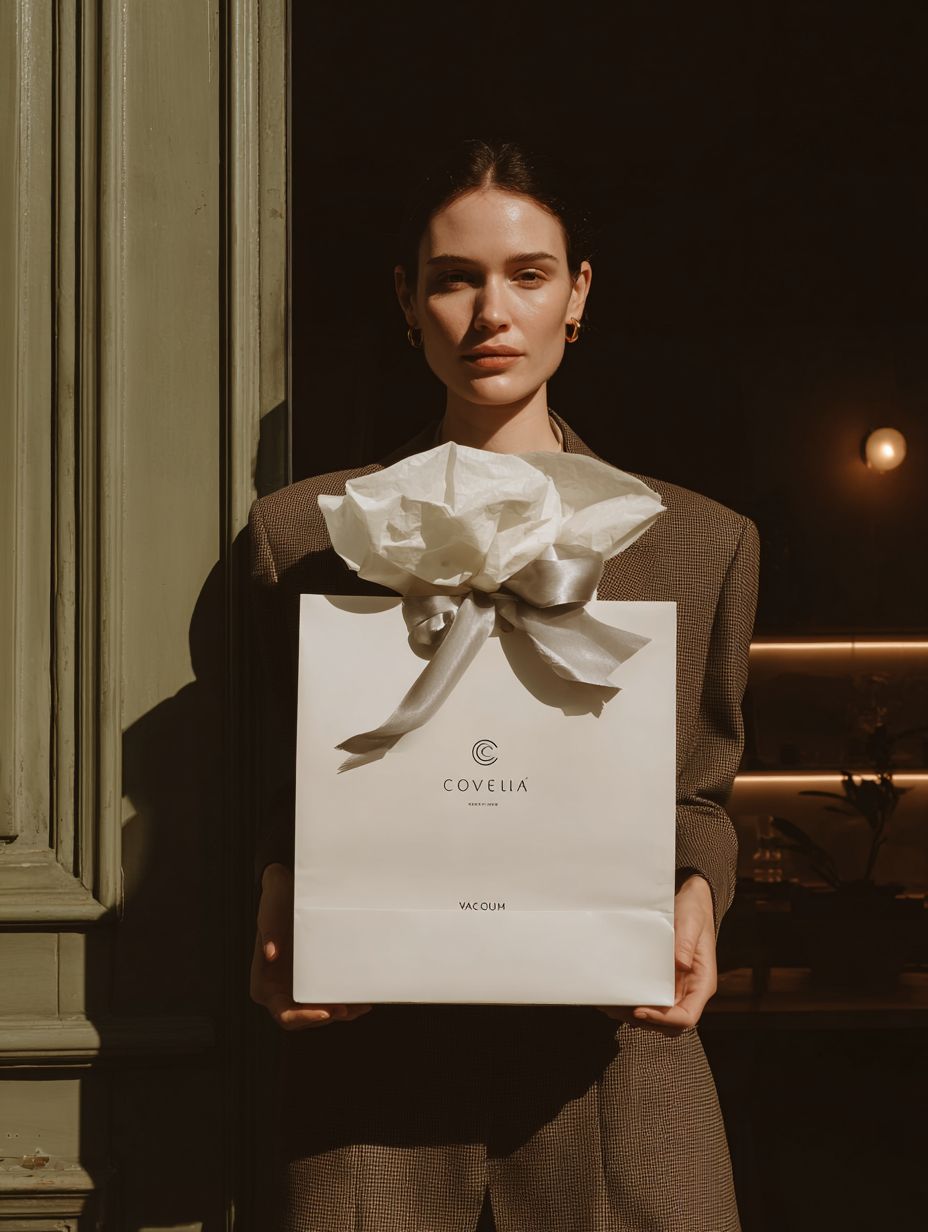 a photo of an elegant woman holding and showcasing the "covella" brand bag with white paper adorned by a silver ribbon bow on top. the logo is prominently displayed in the centre of the bag which has 'vacuum' written beneath it. she stands against a backdrop that suggests a luxury or high-end fashion ambiance. her posture exudes confidence as she holds the shopping bag for display, adding to its overall elegance. no props, no flowers --ar 3:4 --profile tgp1lfc kw2mmjv 8rqbdno --v 7.0 --s 50