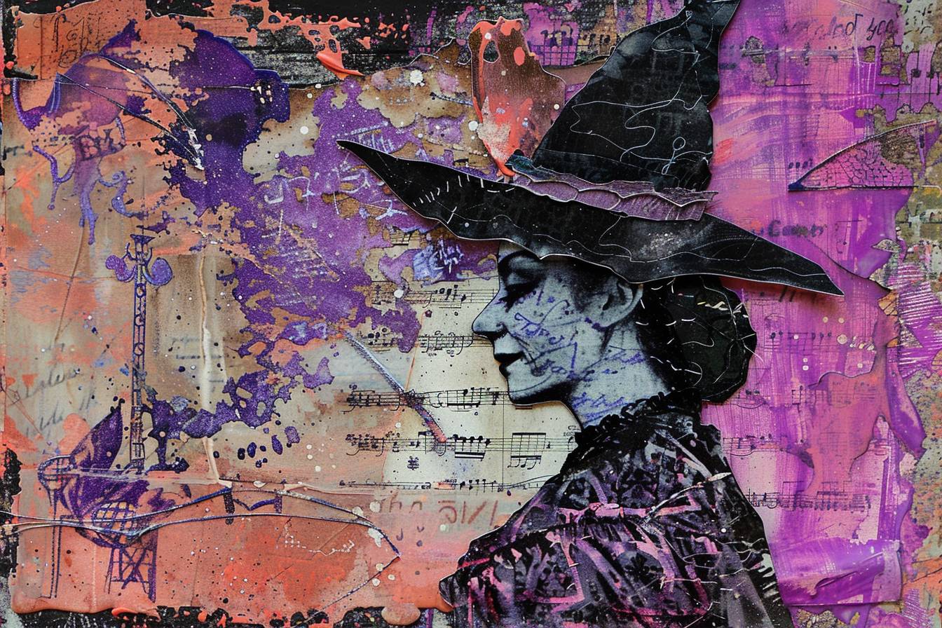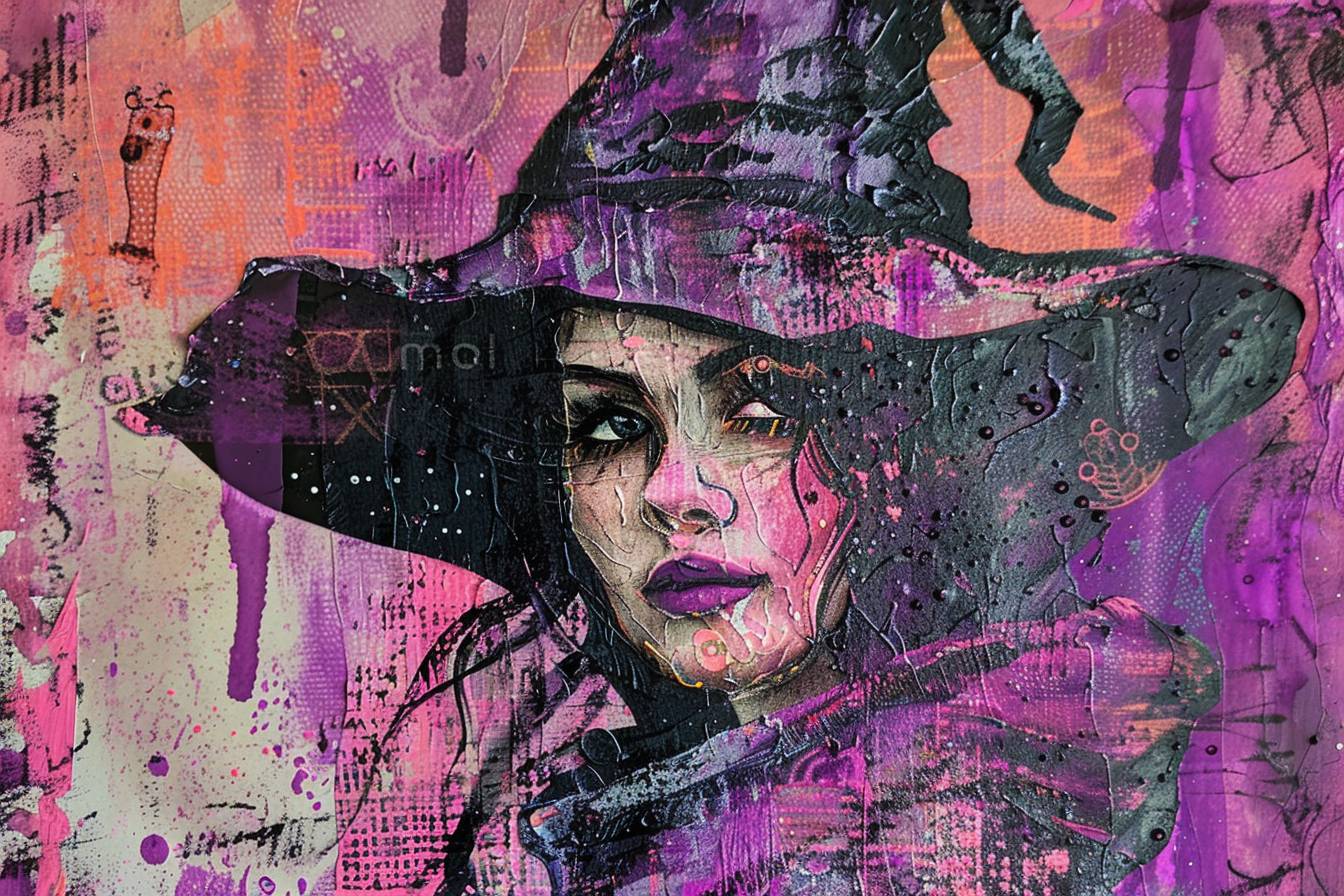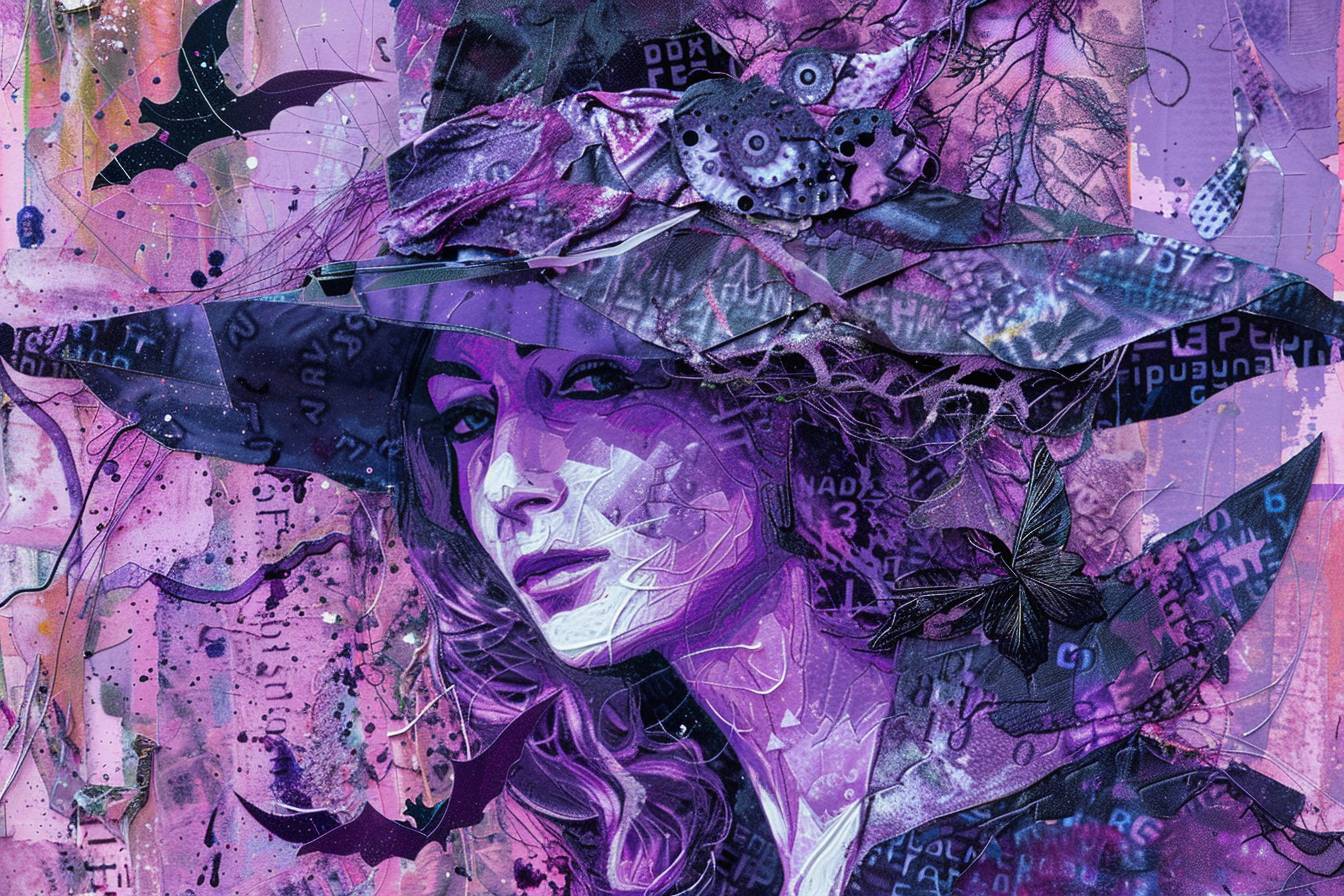 Bruxa em estilo de colagem, com mídia mista de roxo e rosa