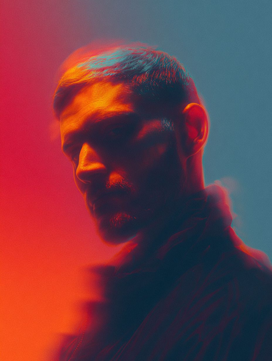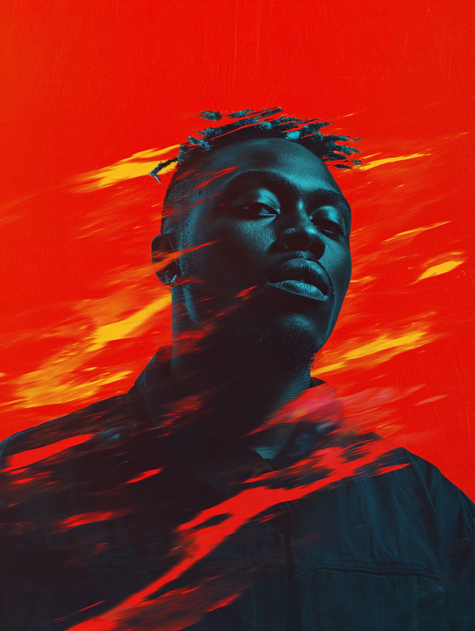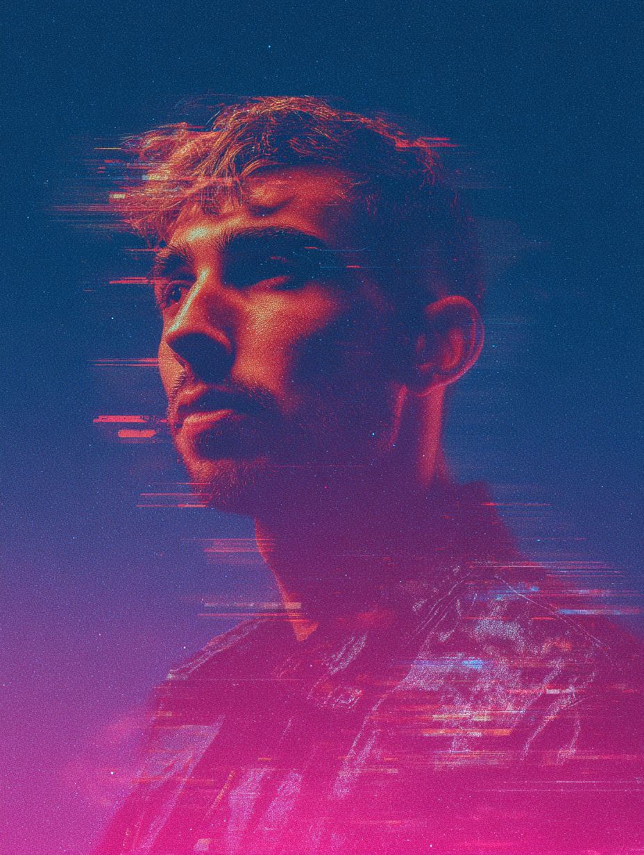 Graphic design inspo, DJ Headshot portrait looking at camera, tour poster, effects, marketing announcement --ar 3:4 --profile t7z8mo1 --v 7.0 --s 50