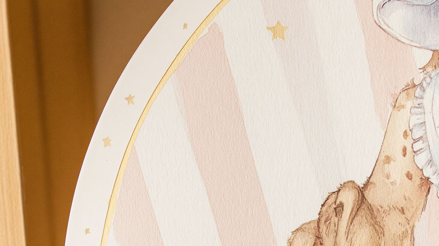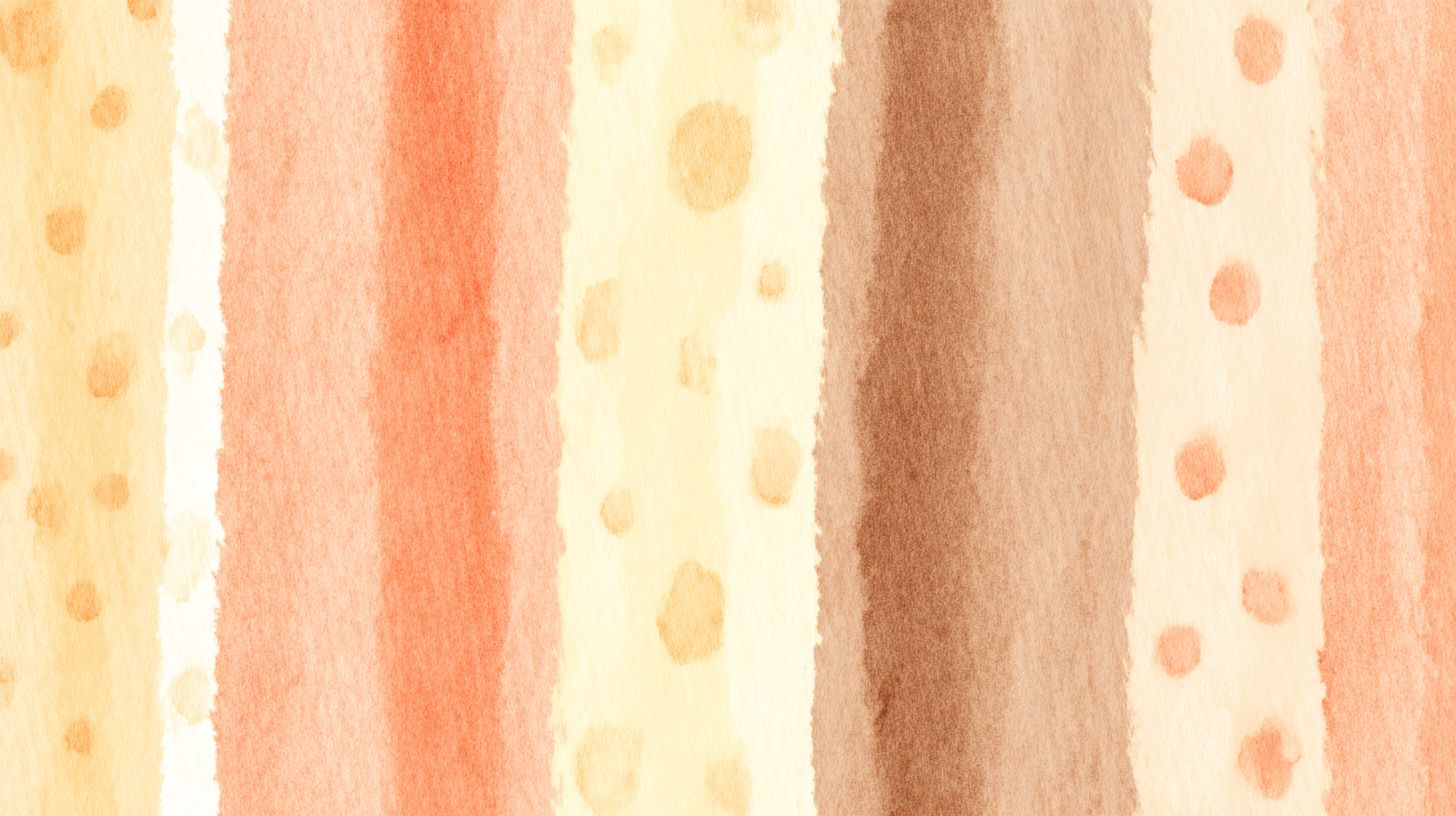Ilustração de arte mural de berçário desenhada à mão, pintada em um estilo de guache/aguarela com pinceladas claramente visíveis e bordas levemente irregulares, fundo creme leve e quente com uma ampla borda decorativa ao redor feita de listras pintadas à mão curtas e grossas, alternando entre rosa pó e um coral mais profundo, cada lista levemente irregular em largura e espaçamento para um visual artesanal brincalhão, em amarelo dourado quente com manchas marrons irregulares espalhadas, combinando com o estilo infantil brincalhão, paleta de cores geral: creme quente, rosa, vermelho coral, amarelo dourado, marrom suave, composição plana, sem sombras ou profundidade realistas, apenas uma textura suave de aquarela no papel.