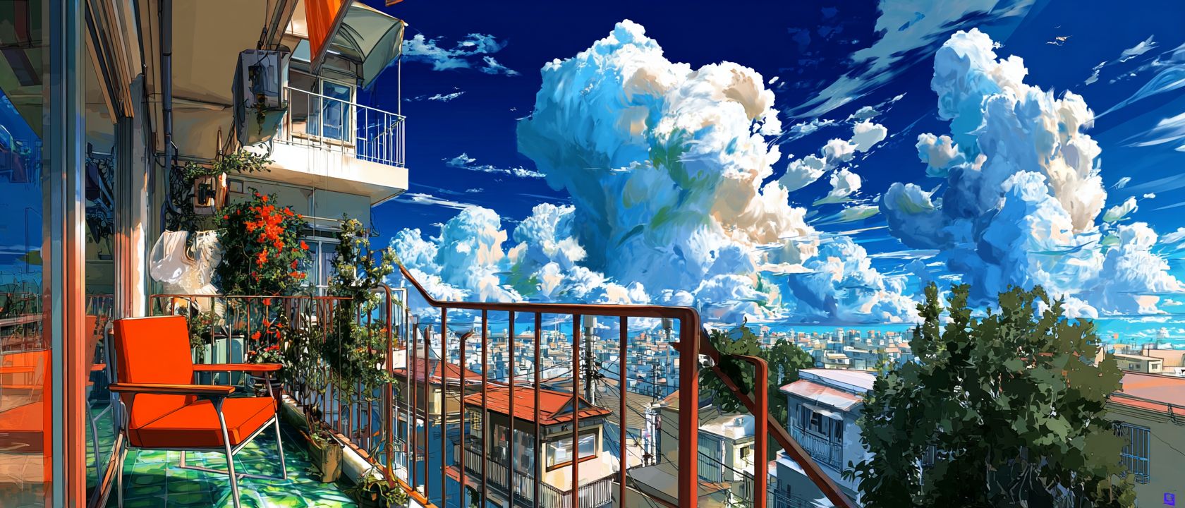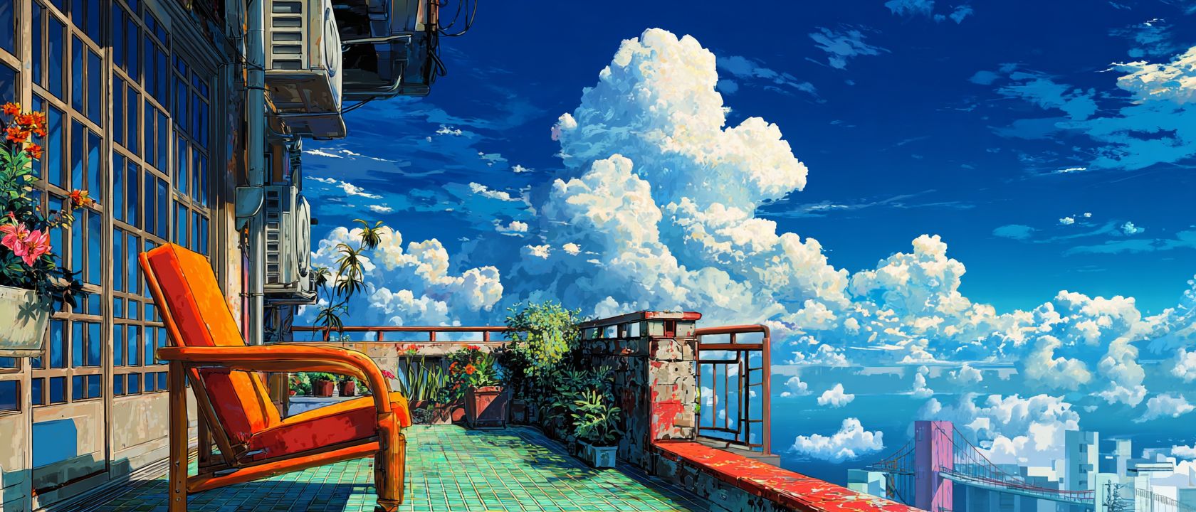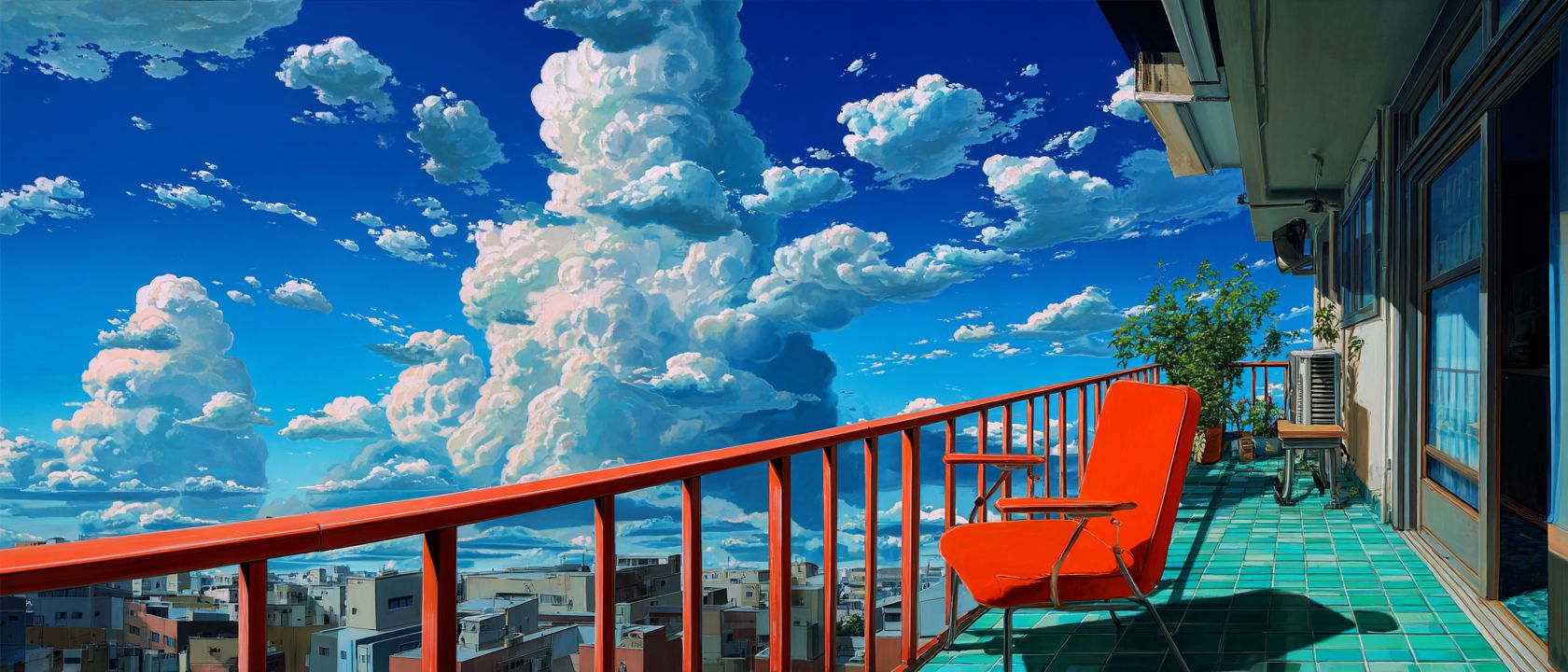 a bright blue sky with white clouds, a balcony in the foreground, an orange chair on it, and some small green tiles underfoot. a painting in the style of ghibli studio, with vibrant colors and a vintage style, highly detailed and hyper-realistic. --no 3D --ar 7:3 --v 7.0 --p 78soi4x --s 50