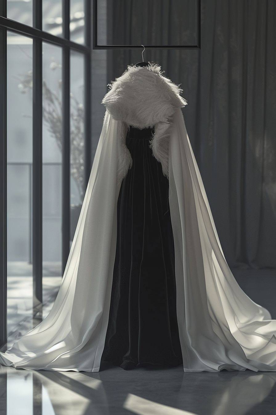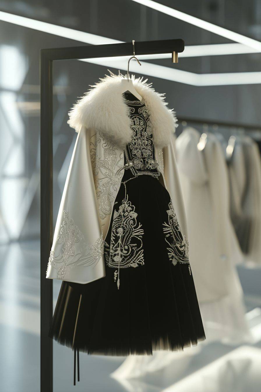A Chinese-style cloak with a long fur collar hangs on a hanger, a long black skirt hangs on a hanger, a loose and comfortable skirt design, white fabric, plush jacket, vertical smoothness, full of charm, nobility, elegance, octane rendering, Unreal Engine 5, ultra high image quality, ultra high definition, masterpiece, bright glass showroom background --ar 2:3 --v 6