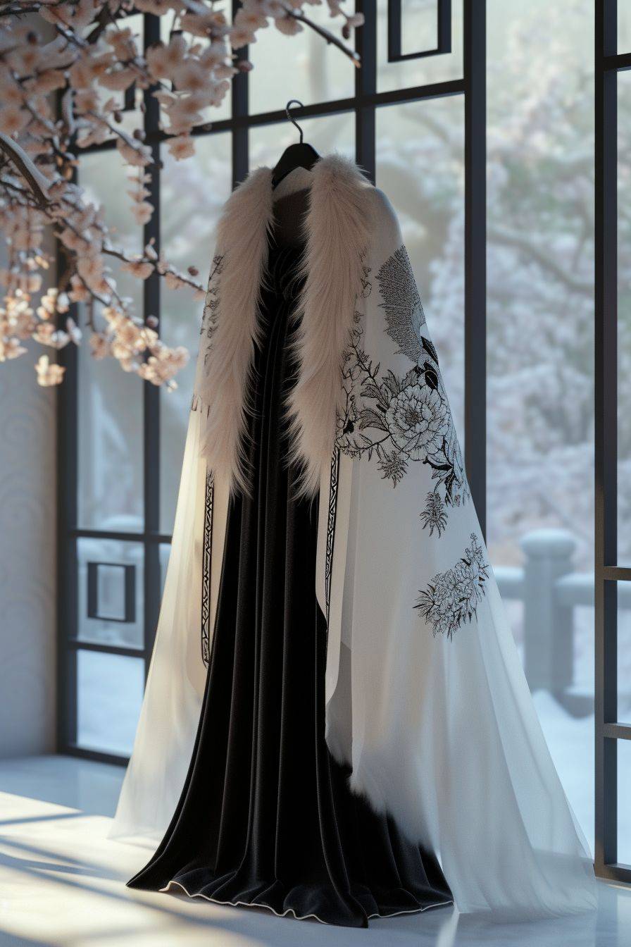 Uma capa de estilo chinês com um longo colar de pele e uma longa saia preta pendurada em um cabide, irradiando elegância e charme.