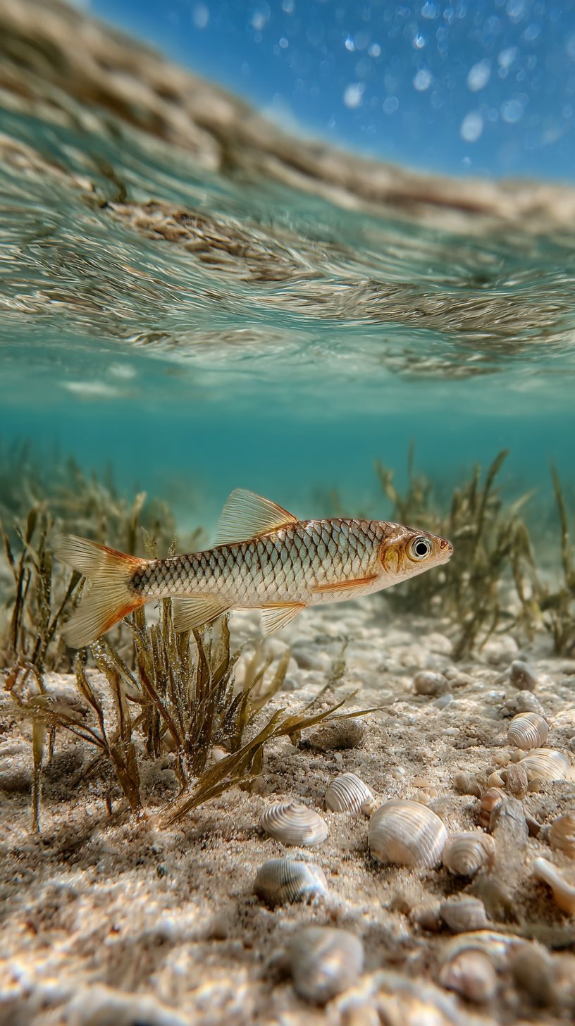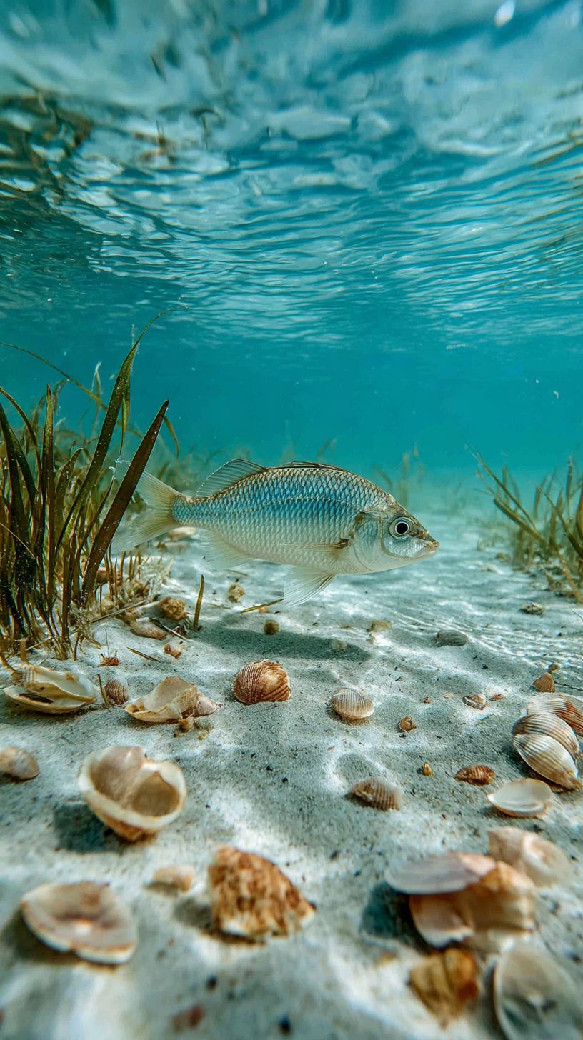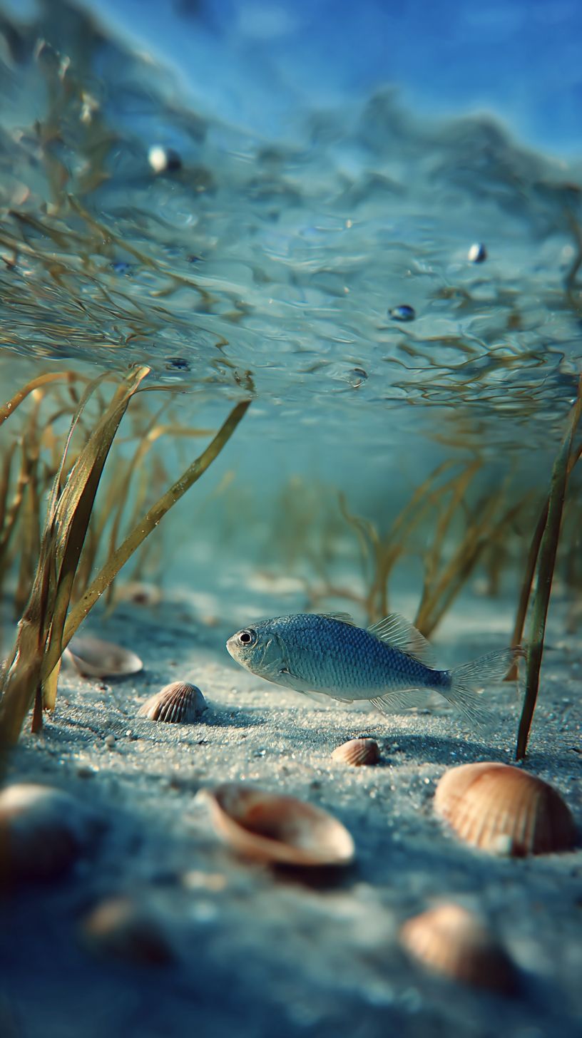 Shallow water flats, a fish swimming, fine sand, seaweed swaying, close-up shots, shells scattered, natural light, clear water surface, light blue tones, macro lens, soft lighting, tranquil atmosphere, dynamic blur, rich details, ecological harmony. --ar 9:16 --v 7.0