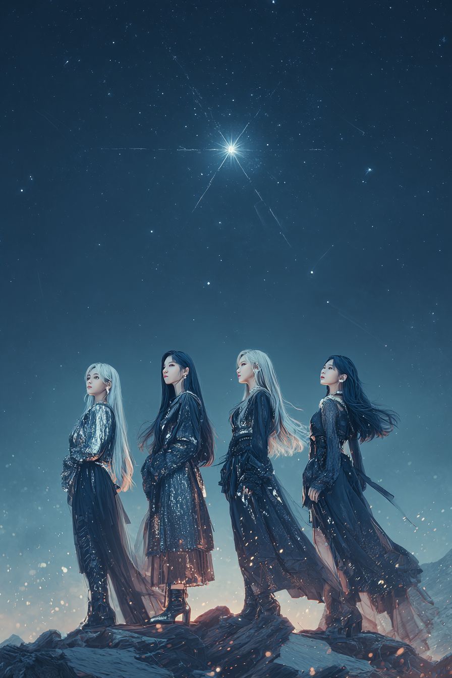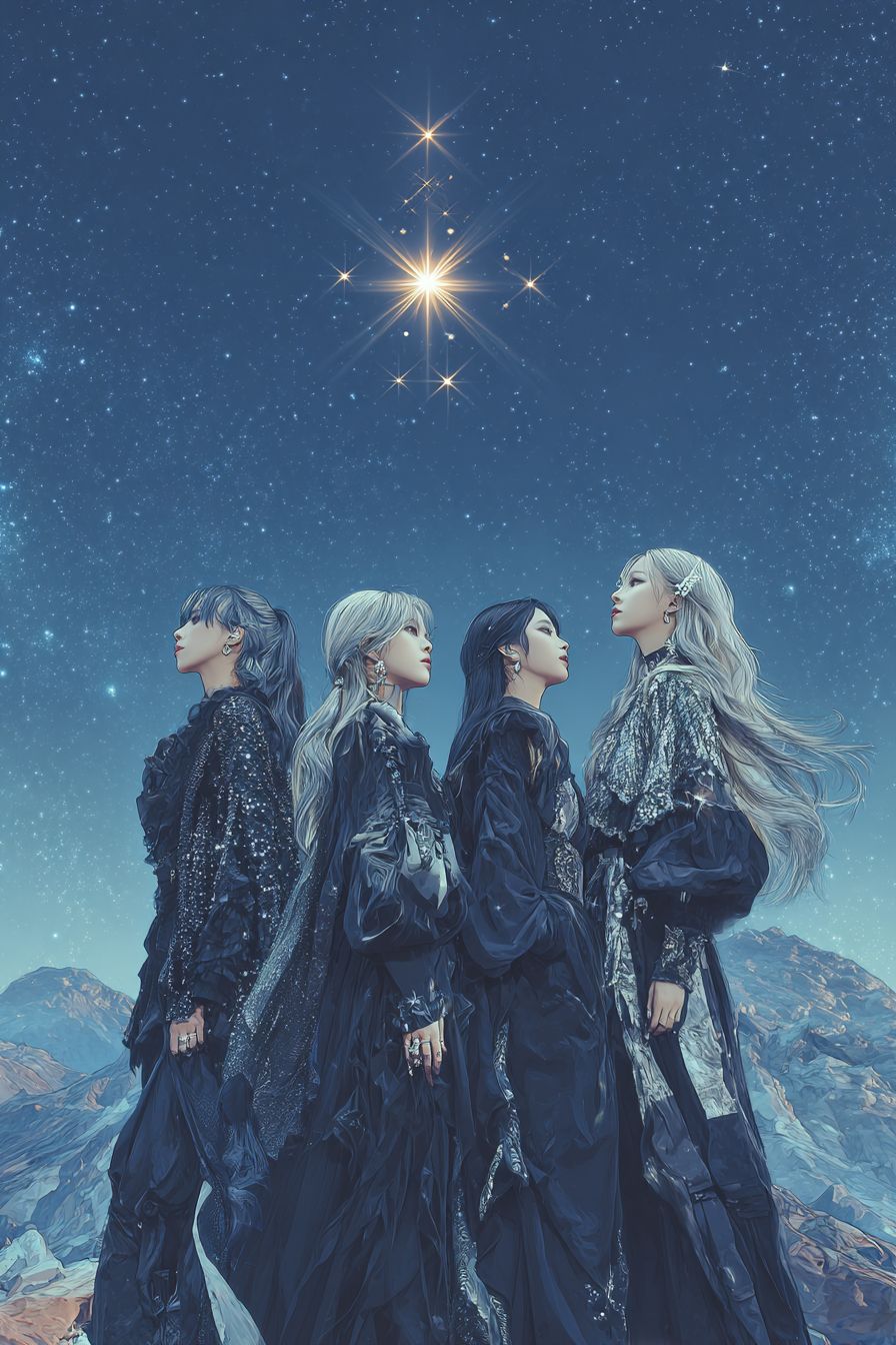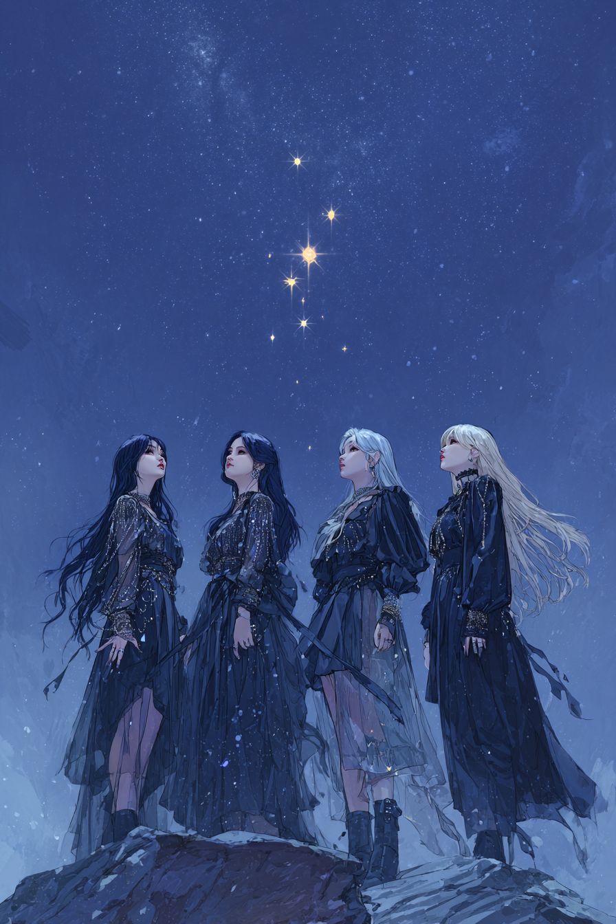 A stunning 4-member K-pop girl group standing together on a starry night hill, gazing up at four bright shining stars forming a perfect square in the dark sky, ethereal and mysterious atmosphere, flowing long hair, elegant black and silver outfits with subtle sparkle, cinematic lighting, soft moonlight glow, dreamy bokeh, high fashion editorial style, vertical book cover composition with empty space at the top for title, ultra detailed, 8k, photorealistic yet slightly fantastical --ar 2:3 --profile yyse98w --v 7.0