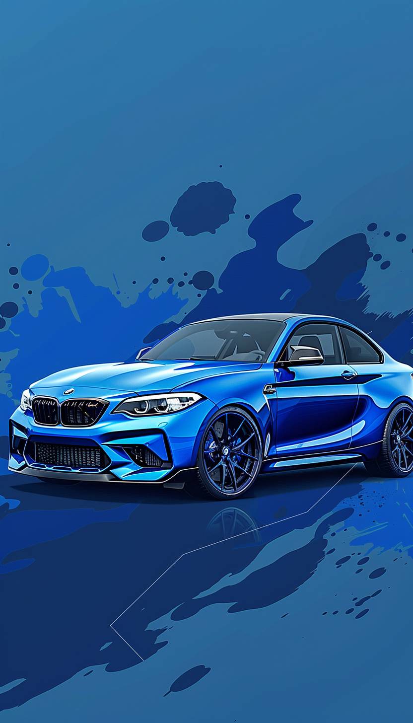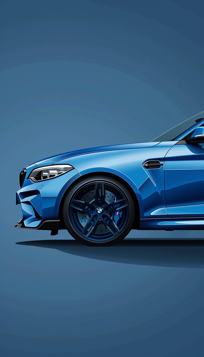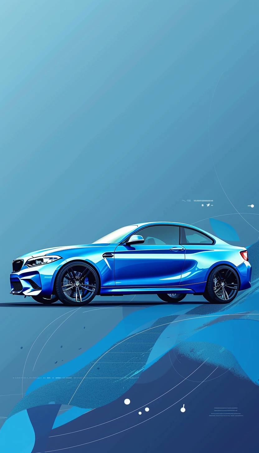 Create a bright royal blue background with subtle design details, featuring a sleek, modern look. In the center, place a side view of a blue BMW M2 with black rims, illustrated in an artistic, vector graphic style with 3D rendering. The car should be a prominent and stylish element, blending seamlessly with the elegant blue backdrop to create a visually striking image. Include a white outline in the left bottom corner to enhance the design, perfect for web and mobile app logos. --ar 4:7 --v 6.0