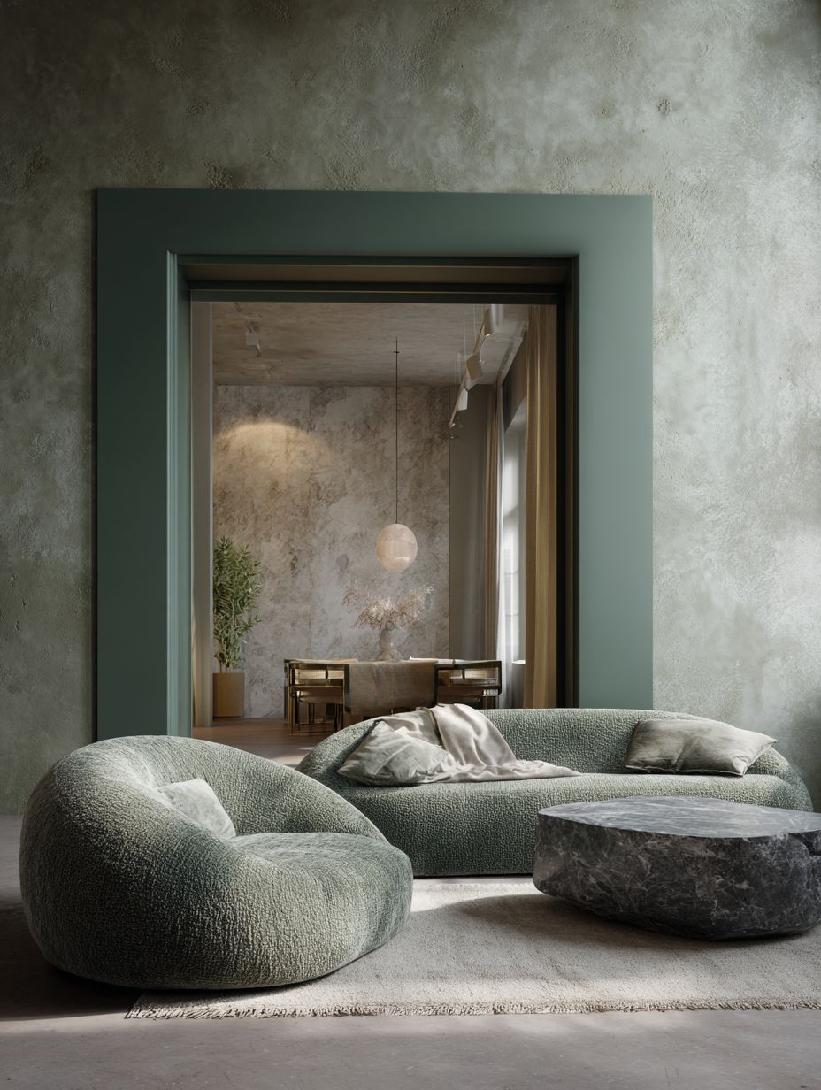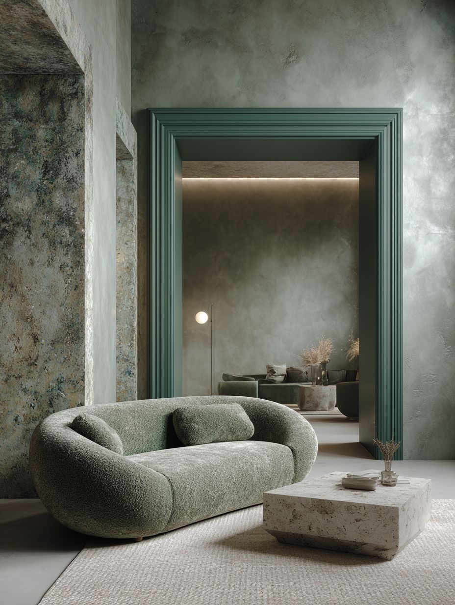 Interior design photography of a refined contemporary living room, Quiet Luxury aesthetic (Warm Minimalism style). Monochromatic palette of muted sage green and deep forest green. Architecture: Clean, refined straight lines. No heavy sculptural walls. A large, floor-to-ceiling rectangular doorway framed in thin matte green metal, looking through to a dining area (creating depth). Wall Finish: Matte textured limewash paint in sage green (subtle, elegant texture). Furniture: A large, contemporary curved sofa upholstered in moss green bouclé fabric. A sculptural stone coffee table. Comfort & Layering: A large textured wool rug, layered textiles, cozy and inviting atmosphere. Lighting: Soft, indirect cove lighting and stylish floor lamps. High-end, sophisticated, livable, 8k, photorealistic --no arches, brutalism, heavy walls --ar 3:4 --raw --profile 5uvhrs9 --v 7.0