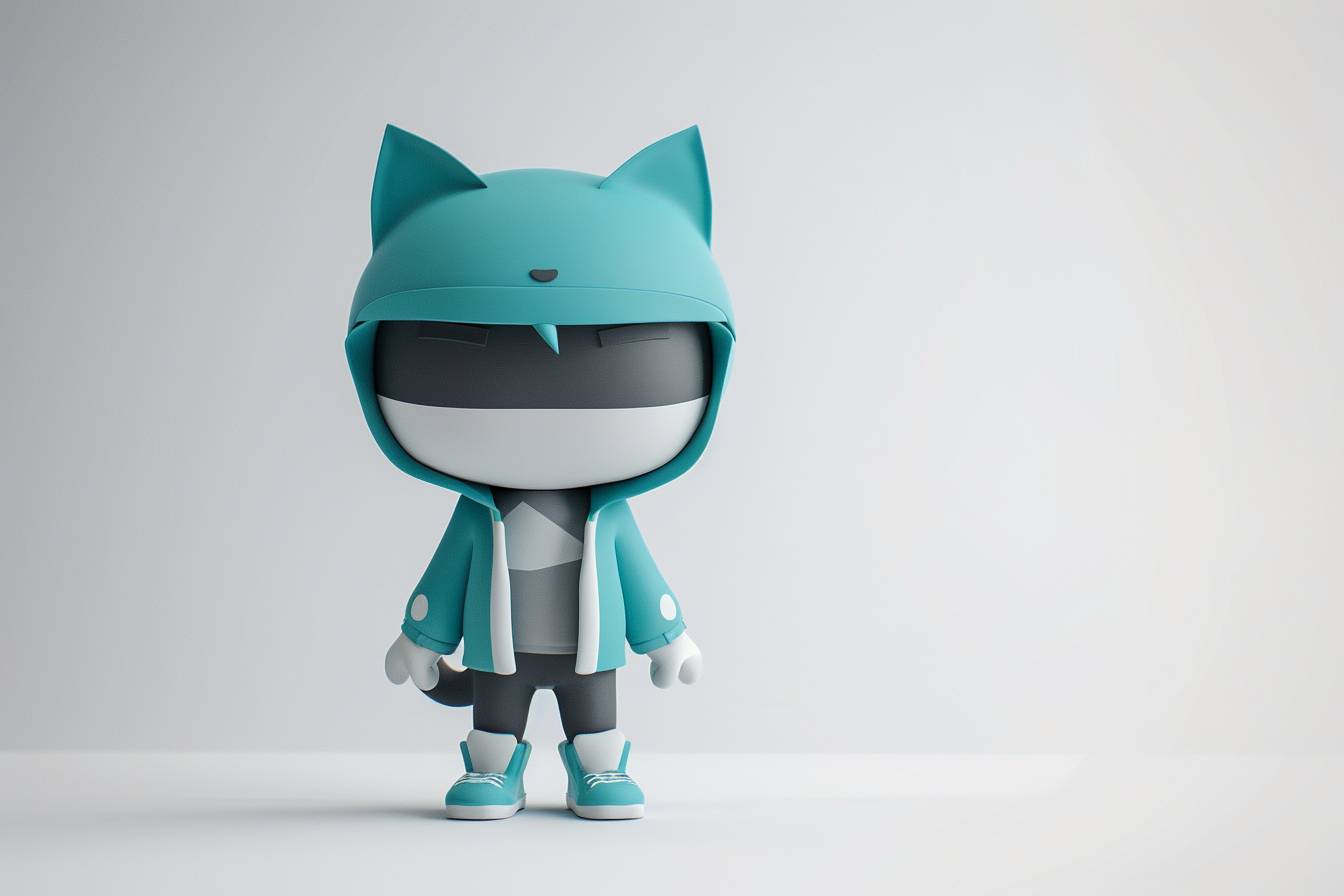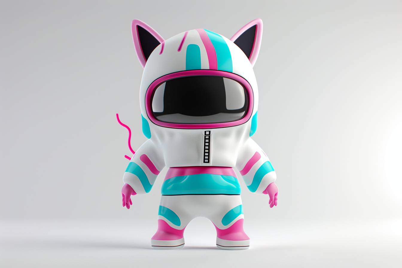 Um brinquedo de vinil em 3D com estilo minimalista, fundo branco e perspectiva frontal.