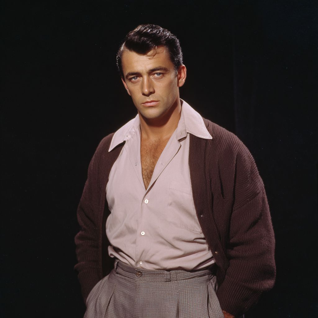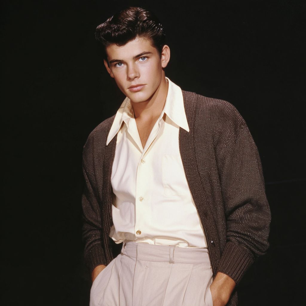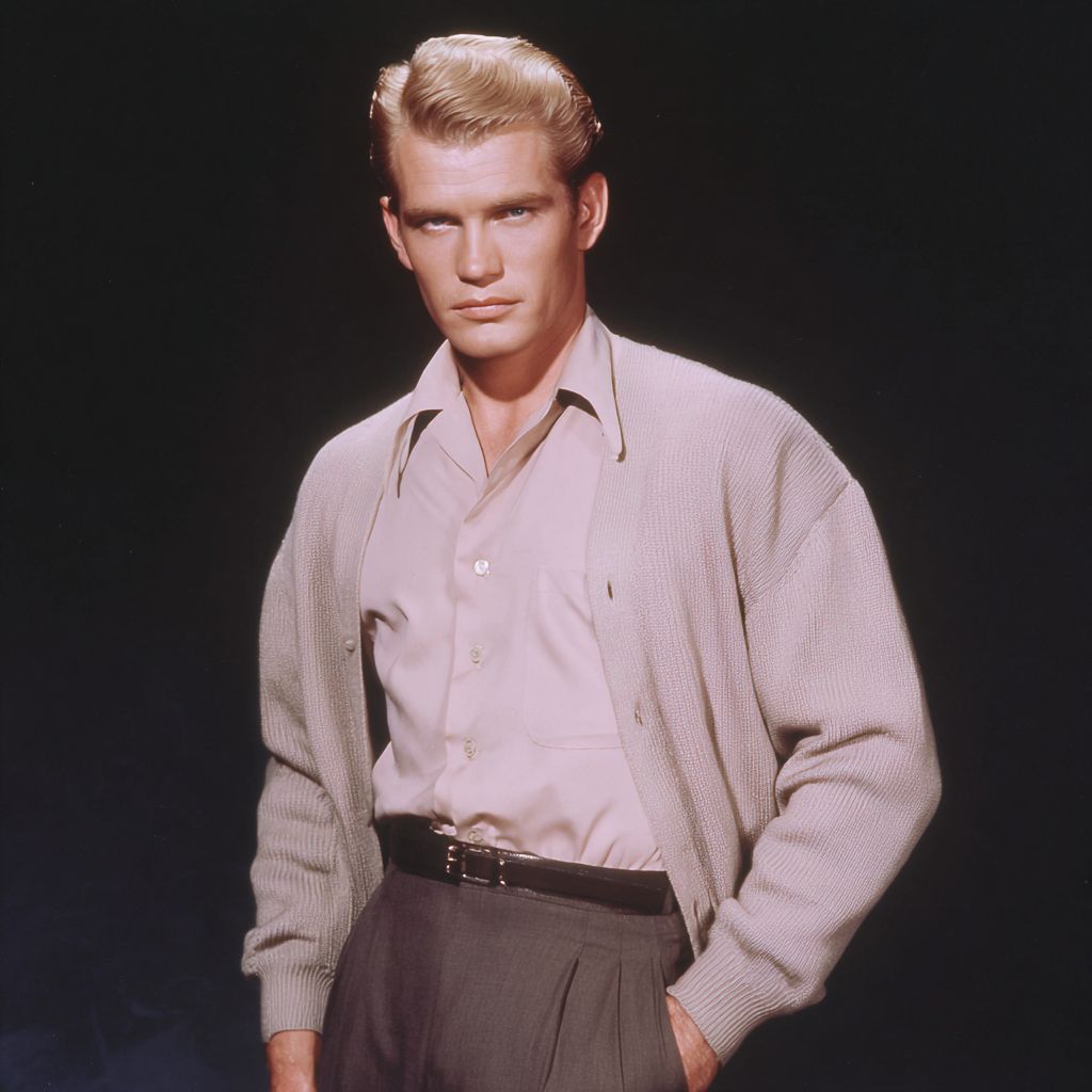 Um homem branco alto, musculoso e pálido com traços marcantes. Ele usa uma camisa de cor clara bem passada, calças de cintura alta e um cardigã ou jaqueta vintage típica dos anos 50, diante de um fundo preto liso, olhando diretamente para a câmera.