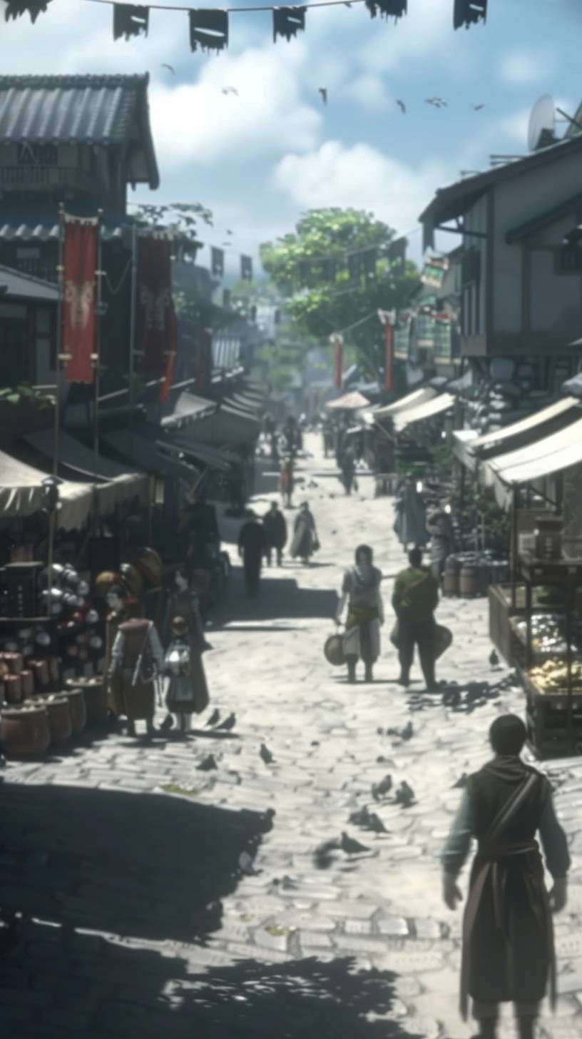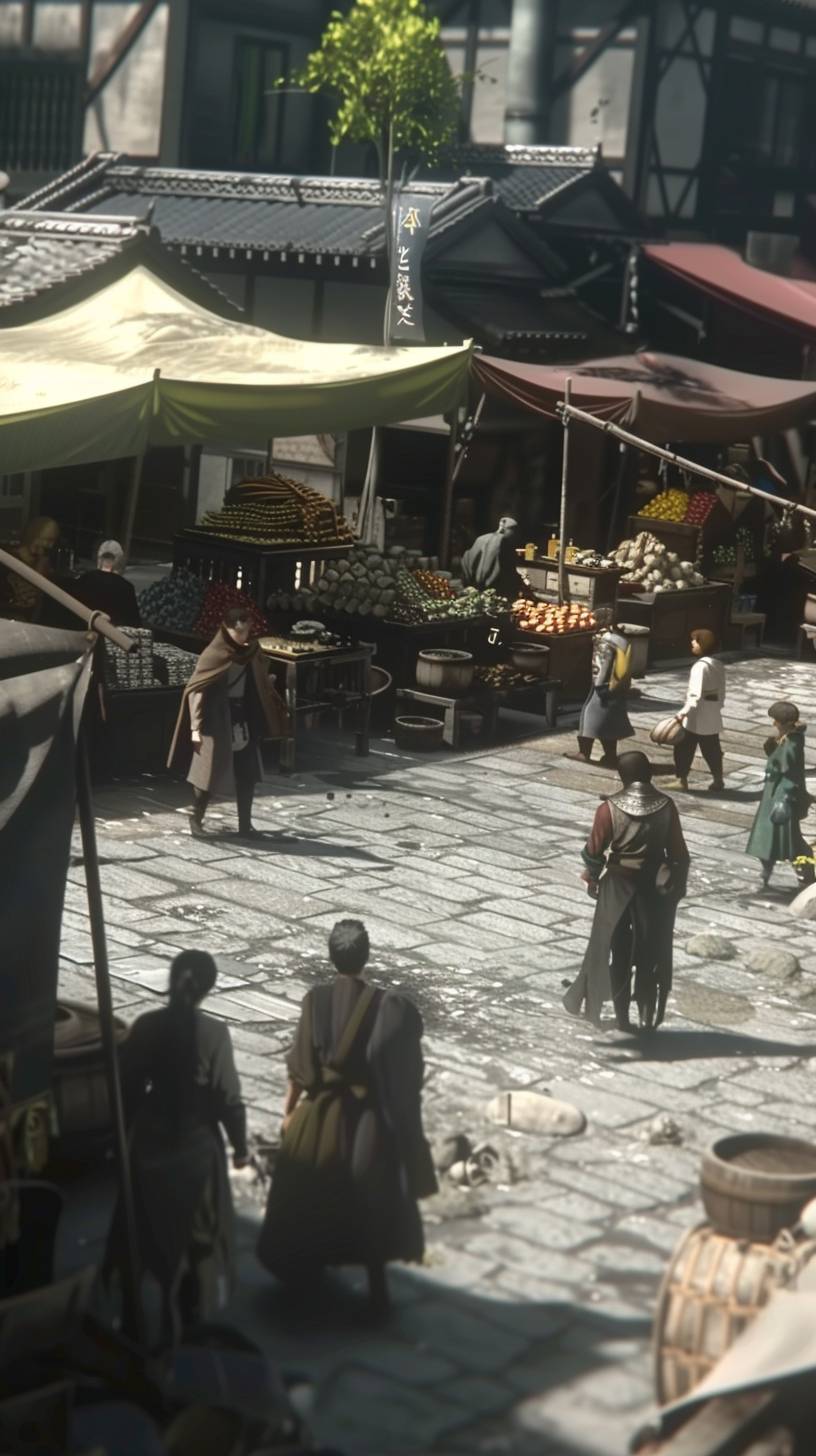 A bustling medieval marketplace, with vibrant stalls selling exotic goods, lively townsfolk, and a sense of lively commerce --ar 9:16 --sref 243722899 --v 6.0
