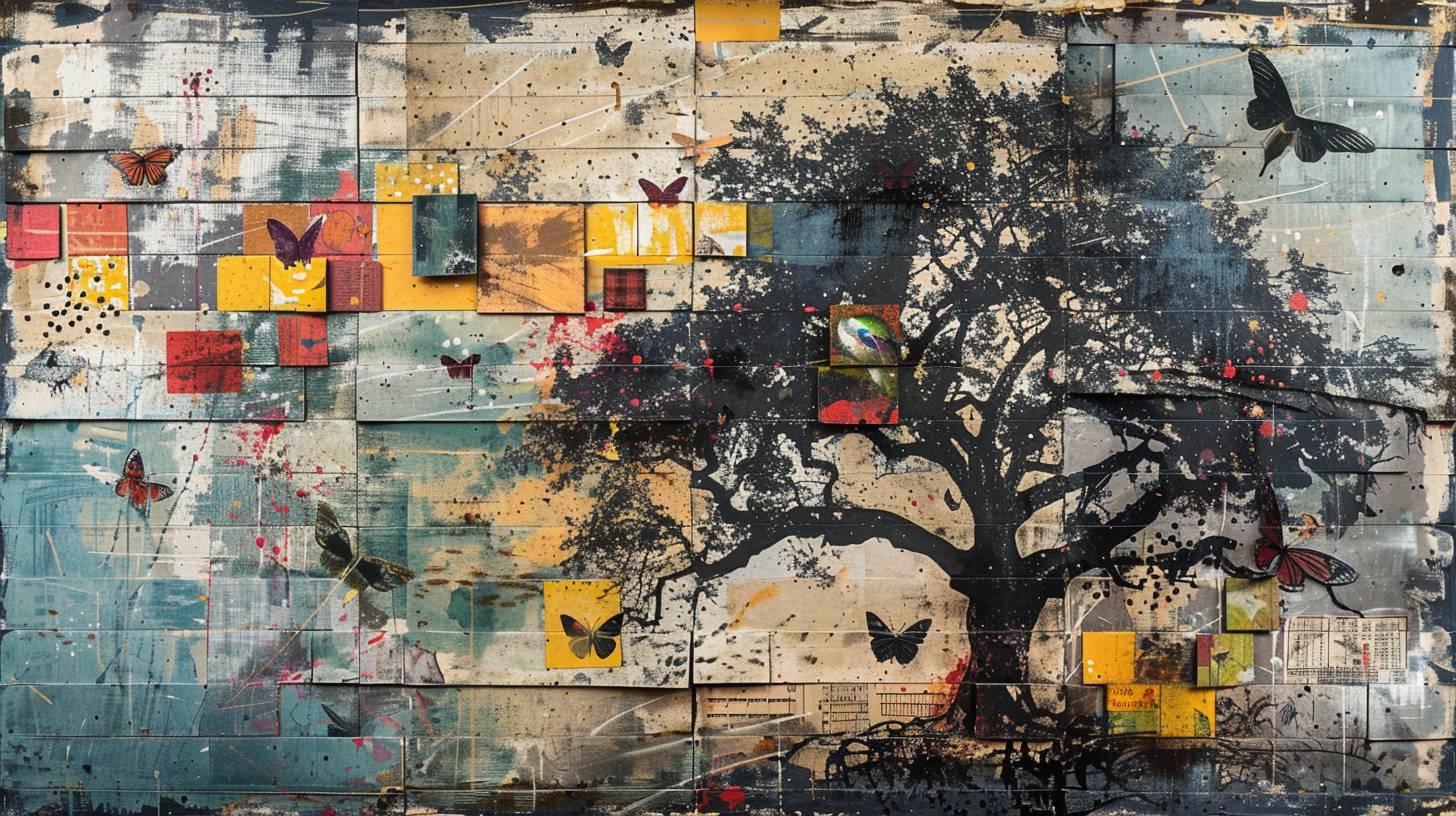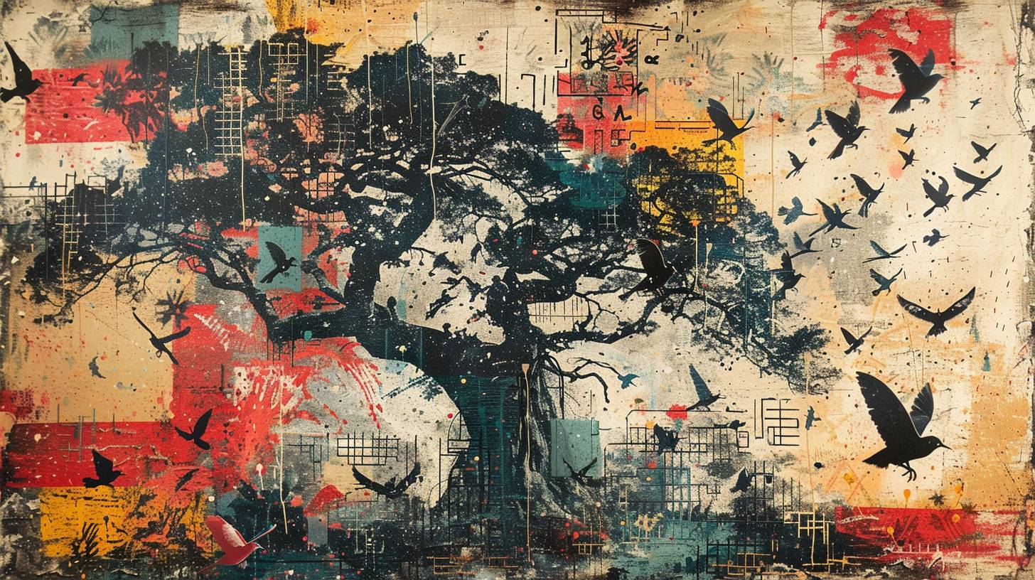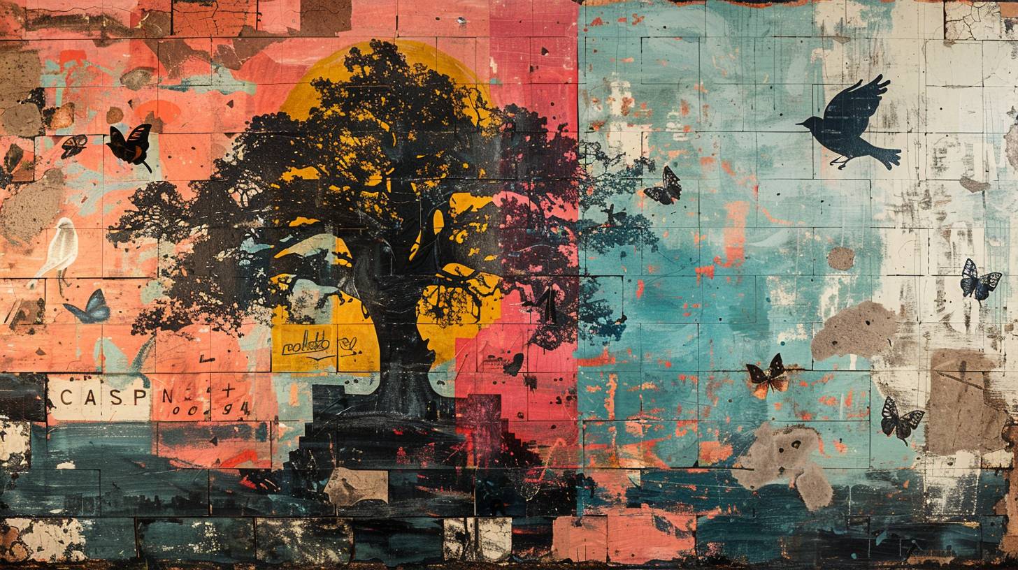 abstract layered silkscreen print, a building mural depicting birds, butterflies, and other symbols of freedom and transformation, flitting around a giant tree, fragmented and distorted rectangles, large letters stencil overlay, low contrast palette, rough texture, flat image --ar 16:9 --stylize 250 --v 6.0