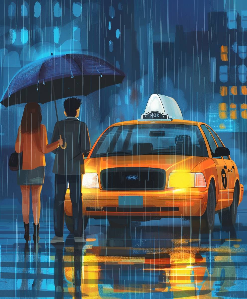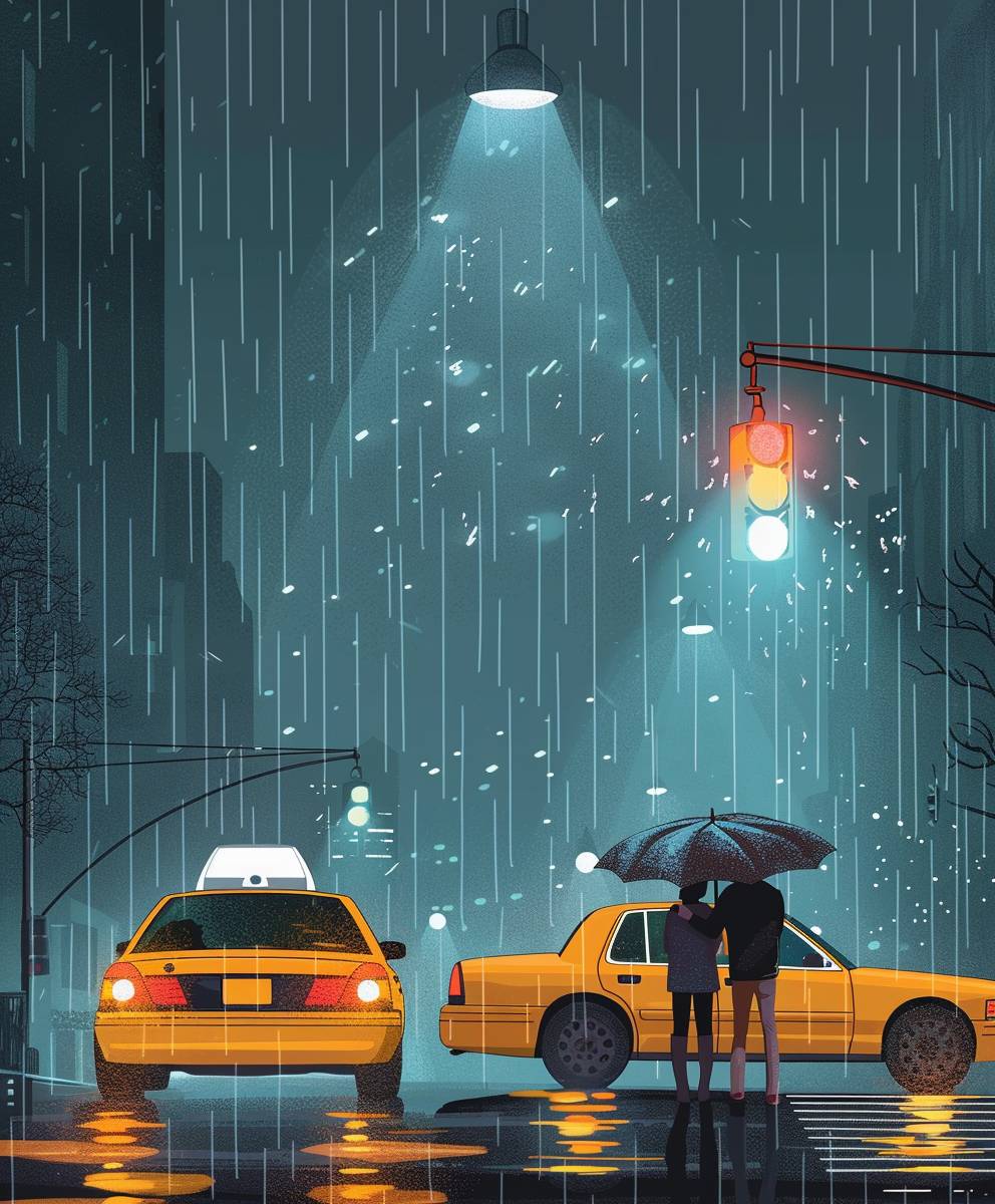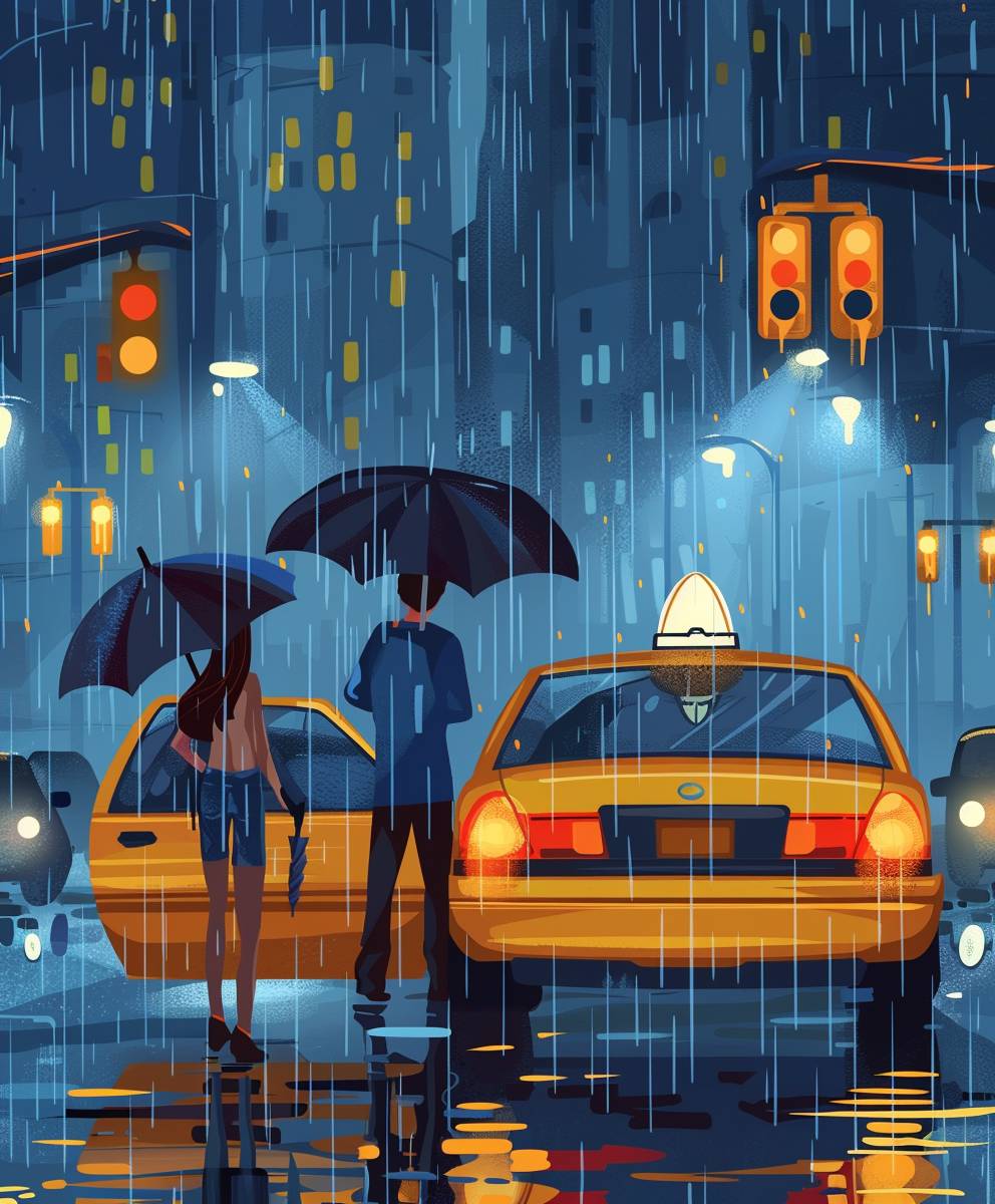 illustration of two people holding umbrellas, standing next to an open yellow taxi cab with lights on, heavy rain, night time, in the style of modern flat illustration --ar 5:6 --v 6.0