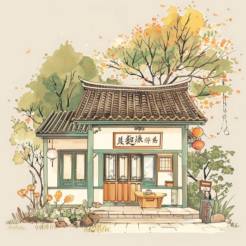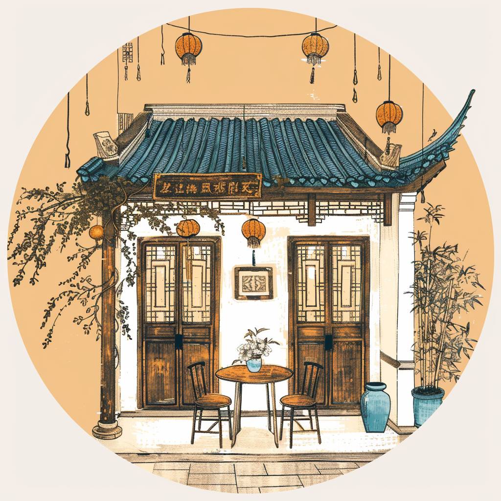 Design a simple doodle with the theme of a guesthouse, featuring Chinese elements and portraying the tranquil elegance of a guesthouse. --v 6.0