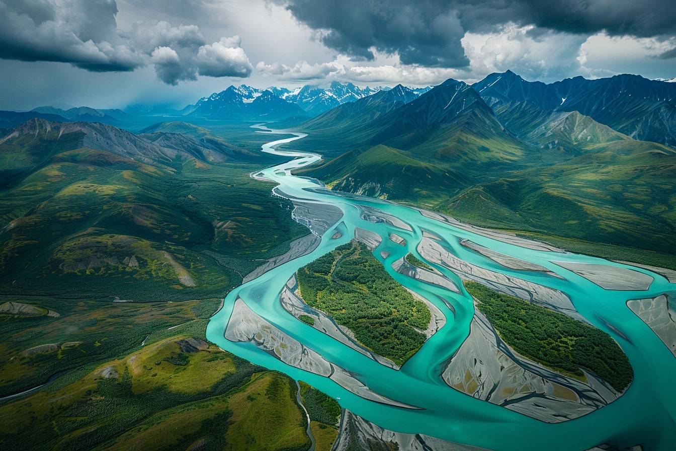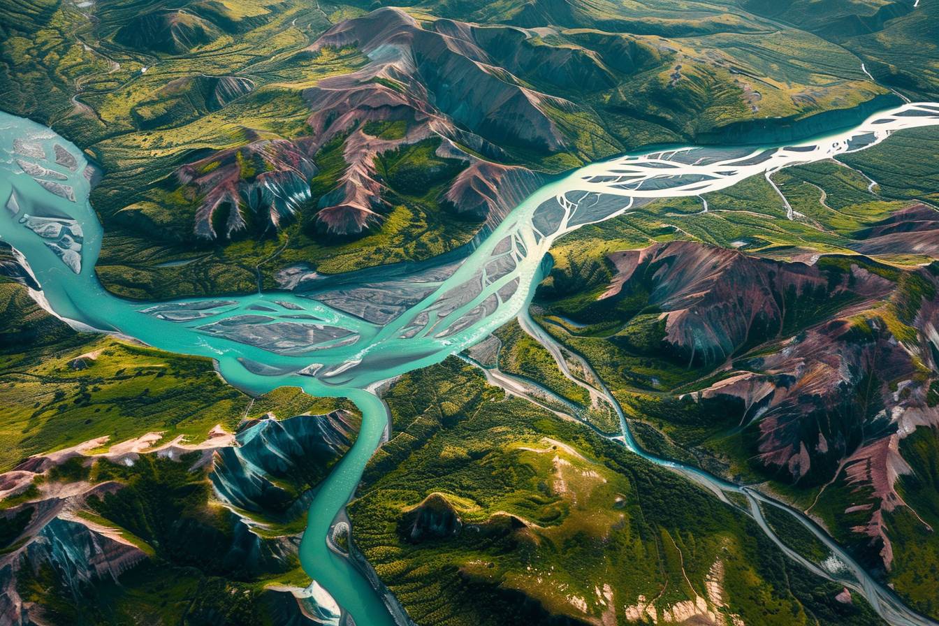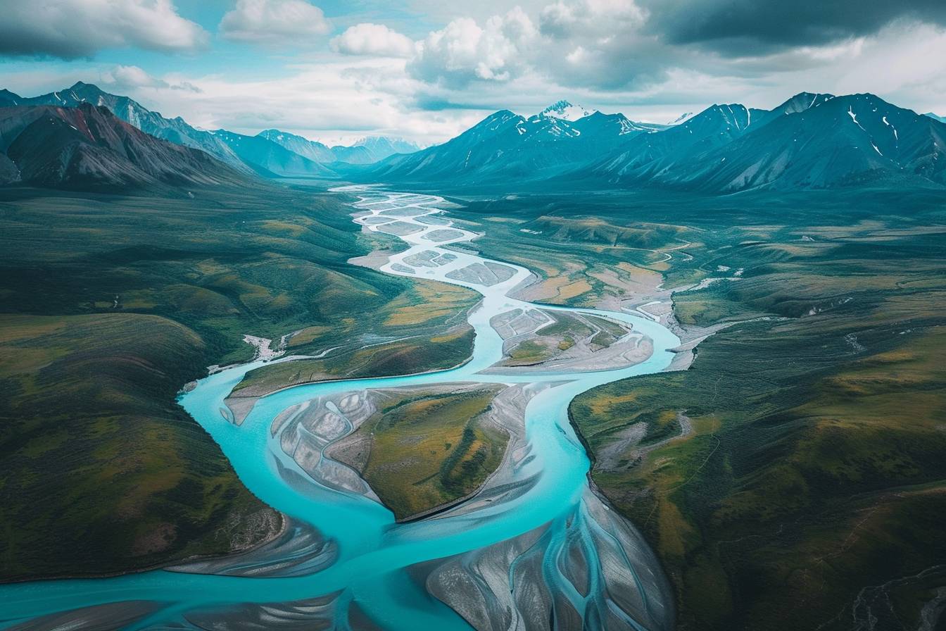 Impressionante foto aérea da vasta natureza e dos rios turquesa de Denali, Alasca