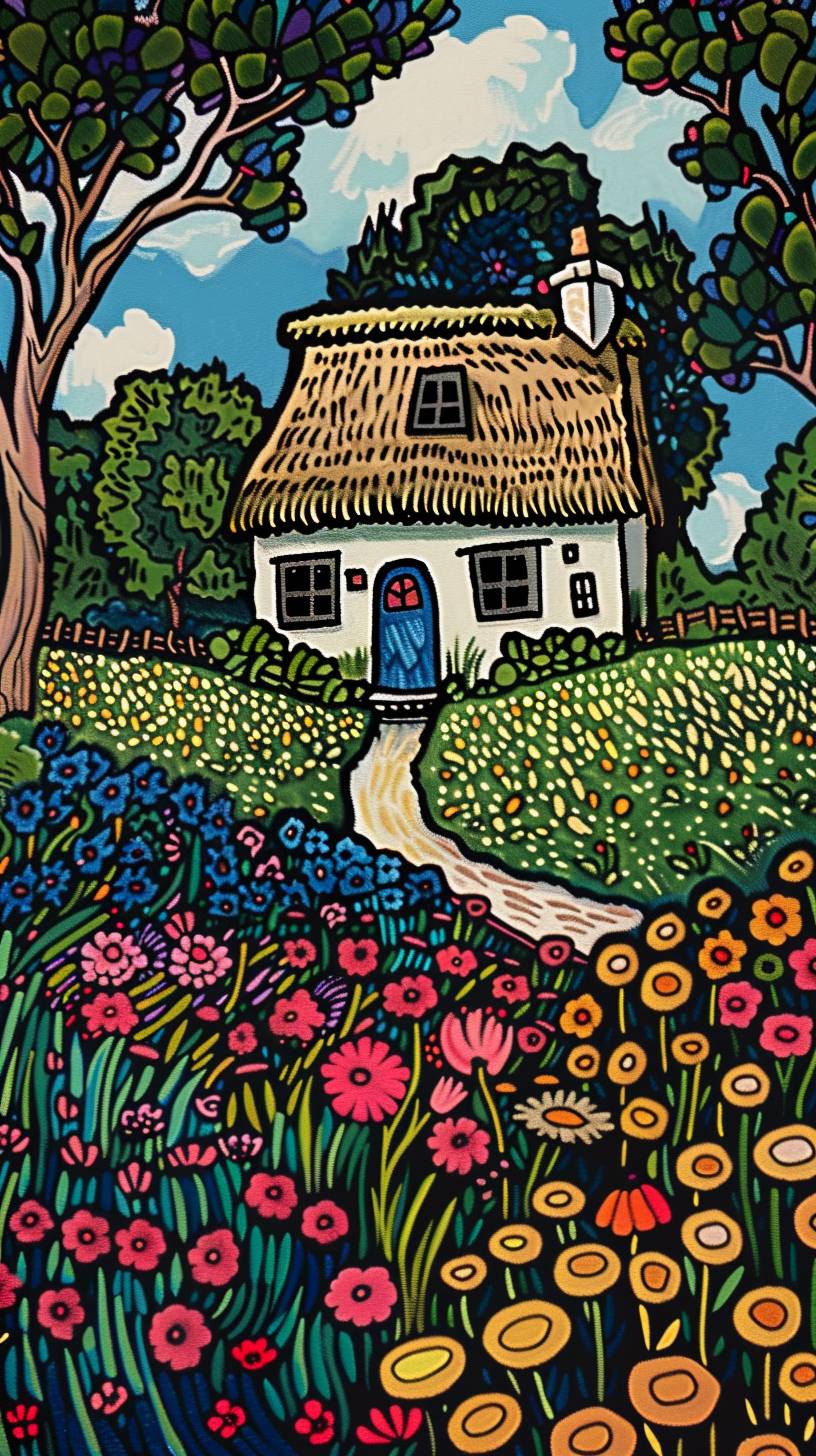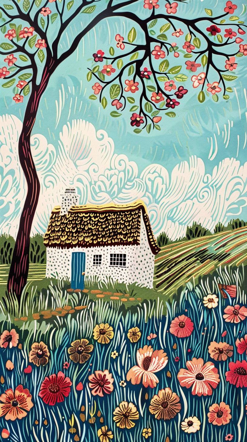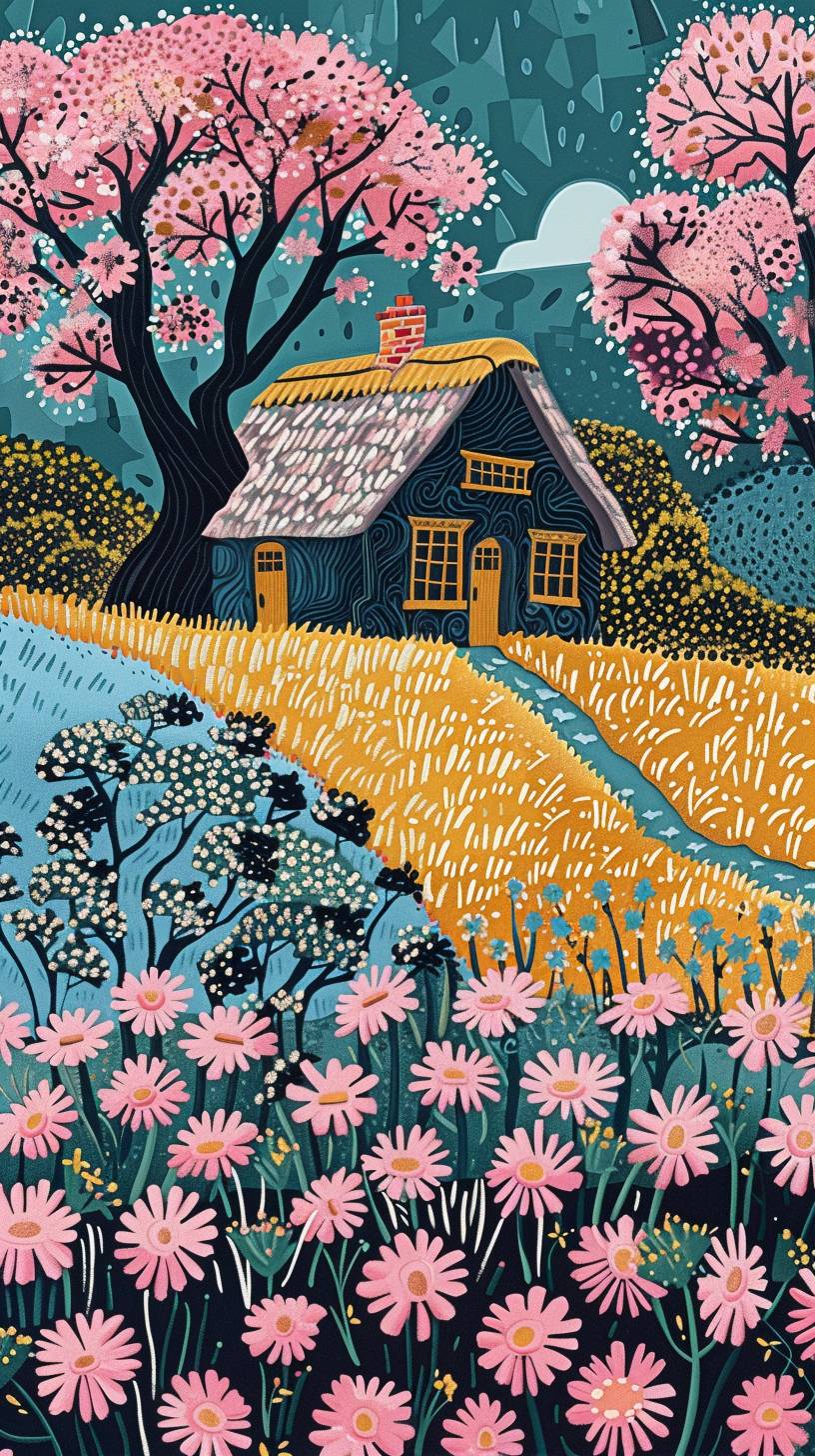 Uma cena de campo tranquila com uma cabana de palha e campos de flores em flor.