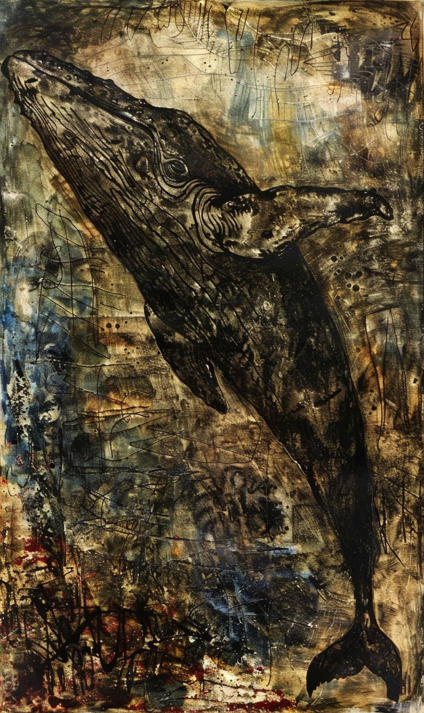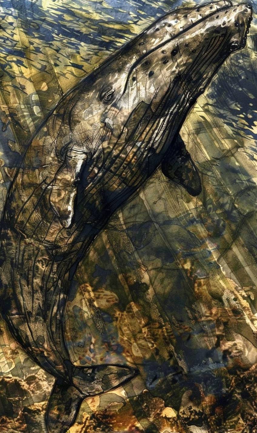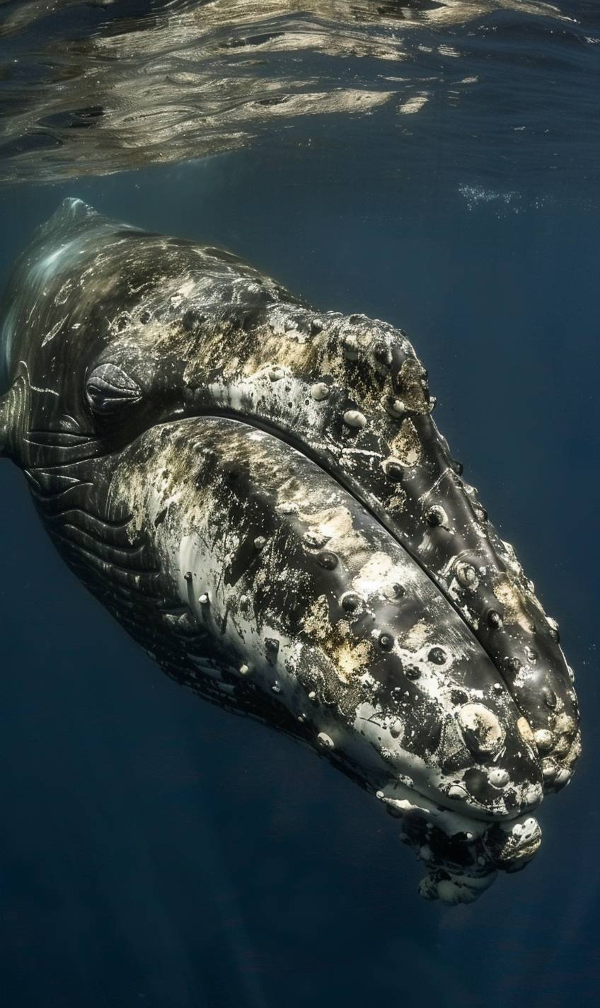 Uma enorme baleia nada no oceano, com a luz do sol criando luzes salpicadas.