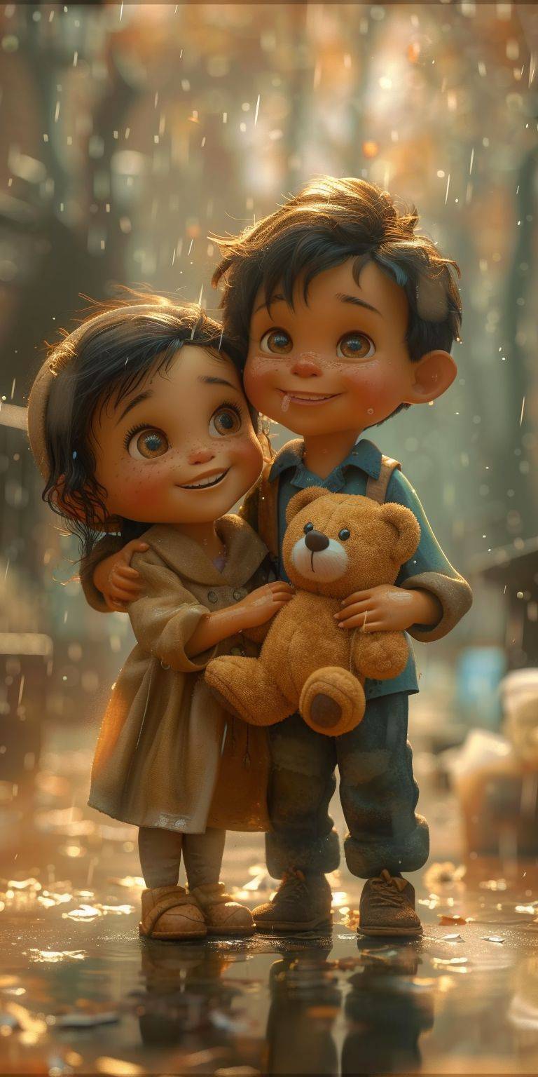 Uma imagem fotográfica 4D de um adorável garoto chibi dando um ursinho a uma menina, com iluminação perfeita.