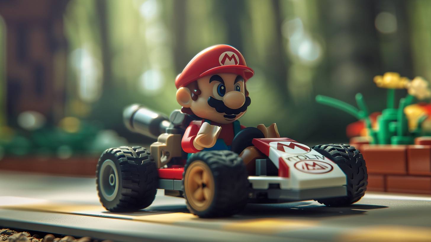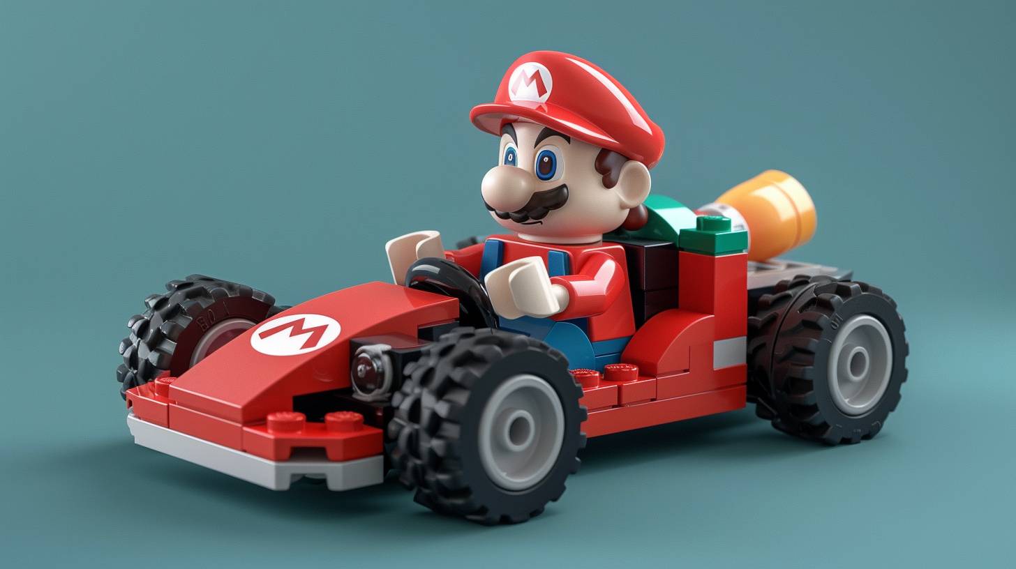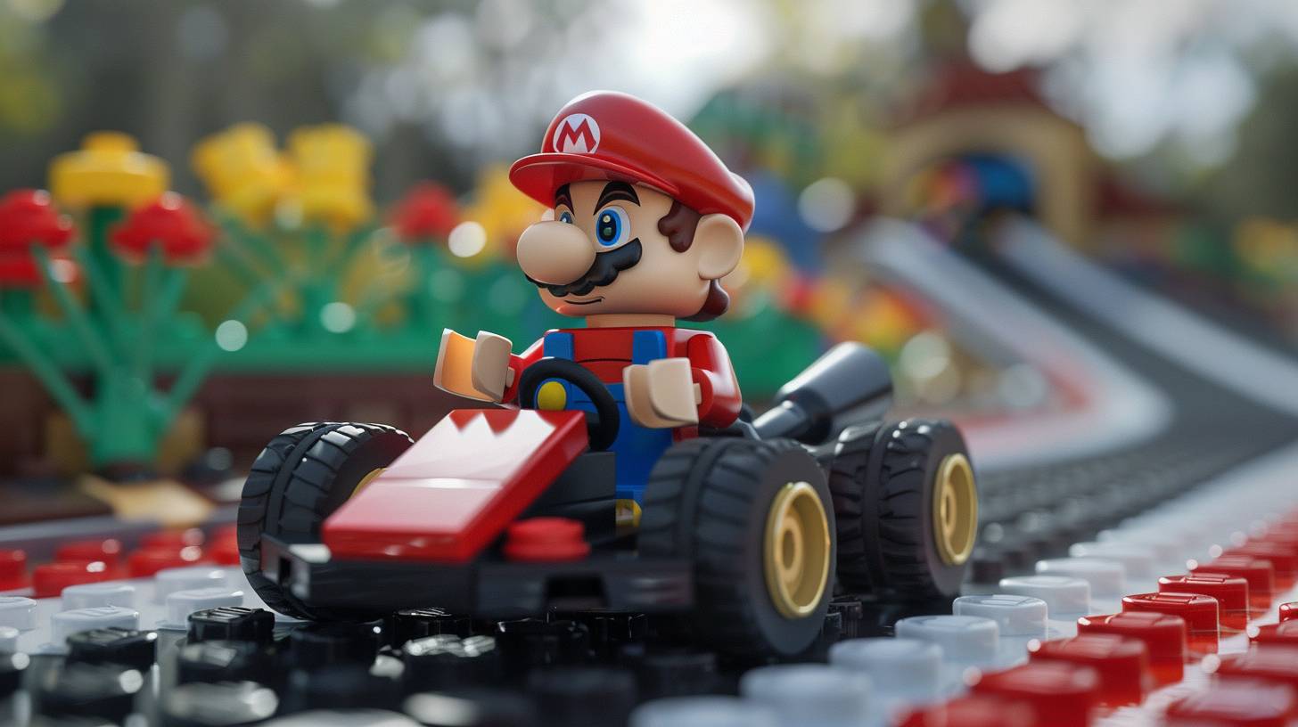 Um personagem em uma posição dinâmica dirigindo em um circuito de Mario Kart, com um kart colorido apresentando elementos icônicos de Mario Kart, no estilo LEGO, cores brilhantes.