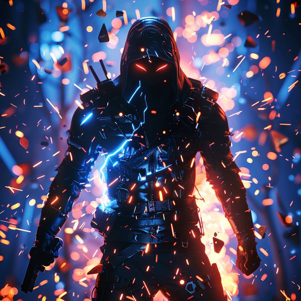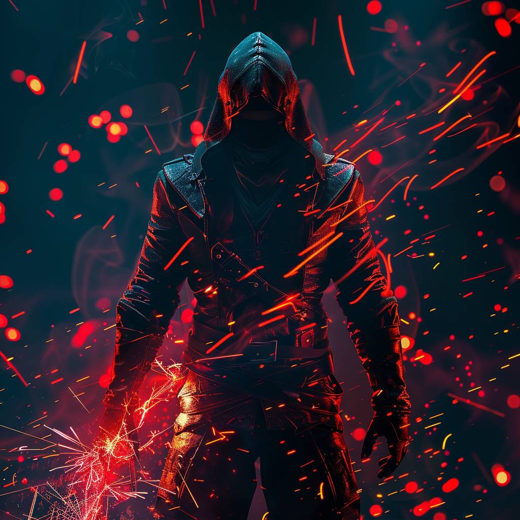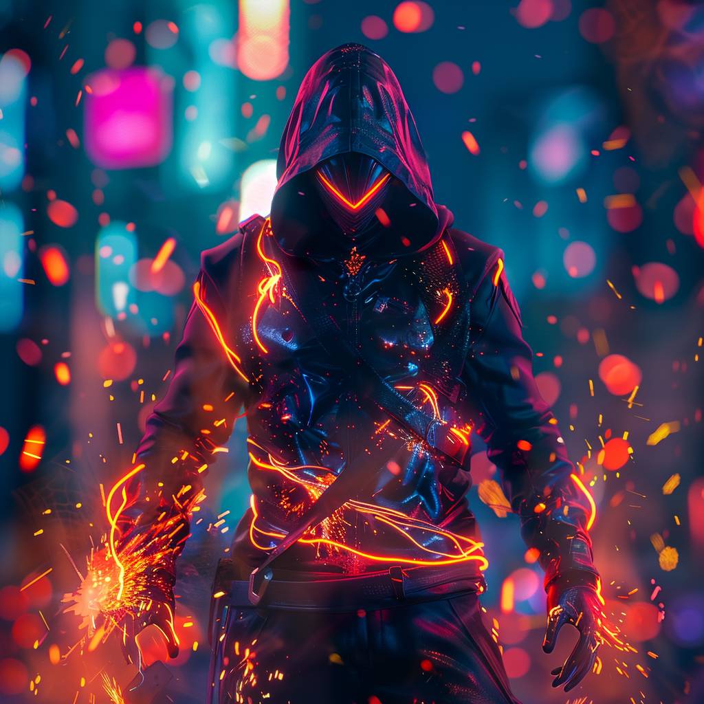 A 3D neon of a male assassin, surrounded by sparks in [Colors], [background], centric, wide front view, glowing, shadow effects, high-quality --v 6.0