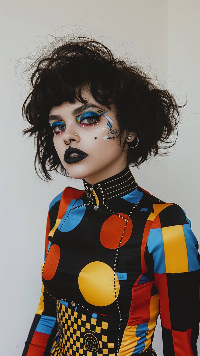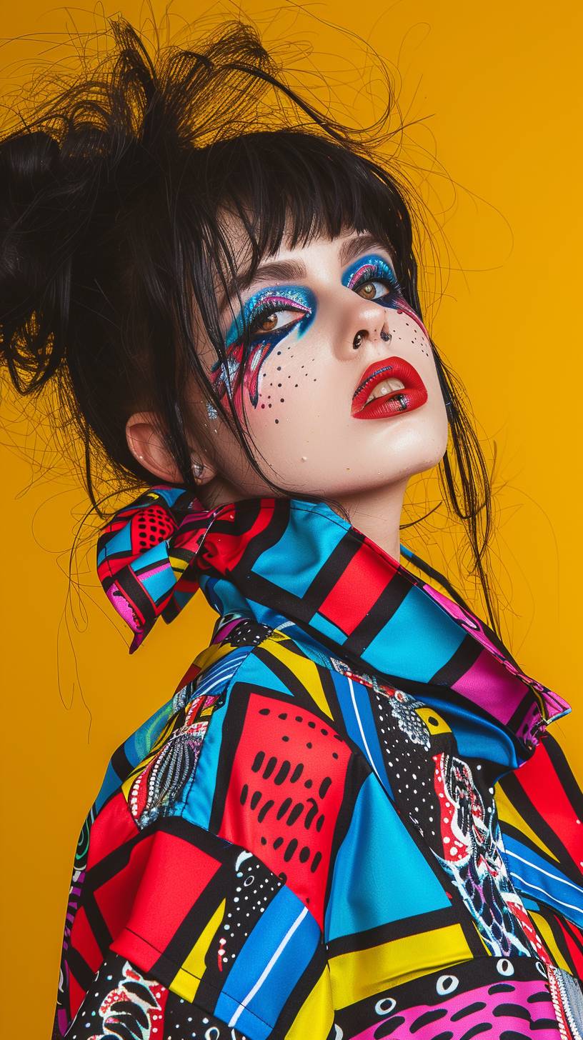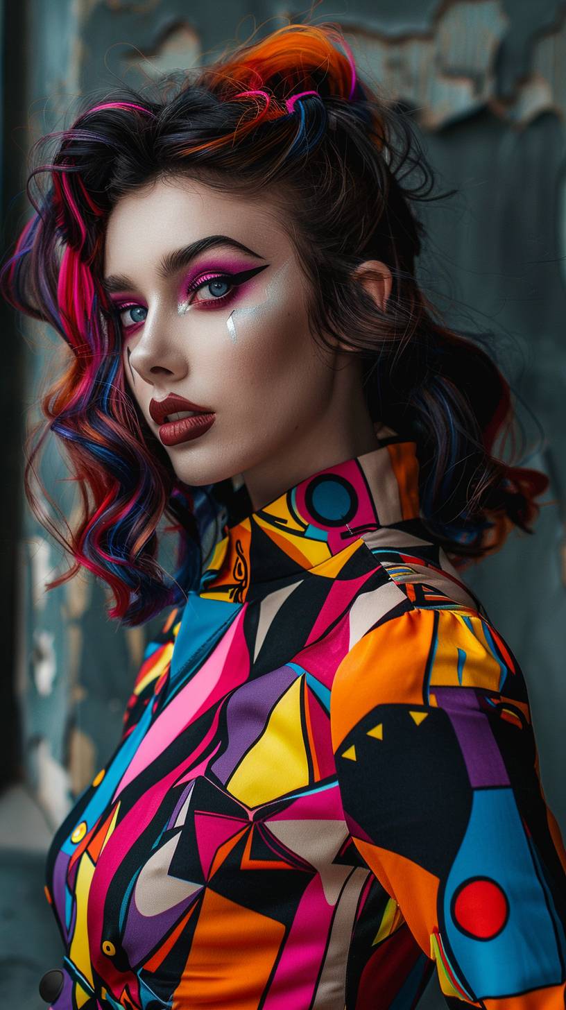 Uma jovem marcante com maquiagem Neo-Gótica ousada e um vibrante traje inspirado na Pop Art.