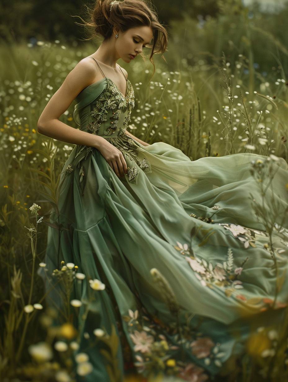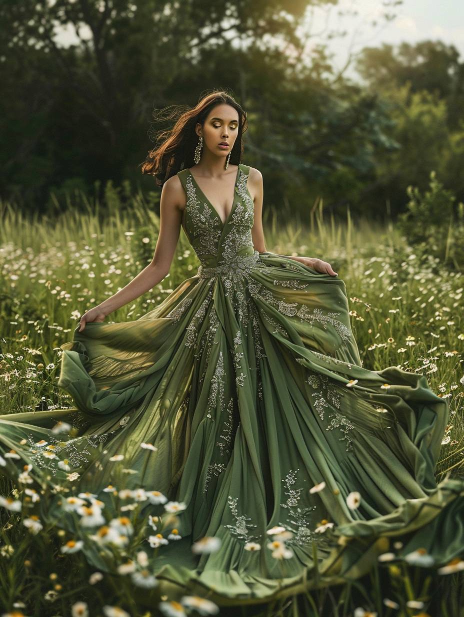 A model, draped in a flowing gown of lush green silk, stands amidst a field of wildflowers. The gown is adorned with delicate embroidery that mimics the patterns of leaves and petals. Her pose is graceful and fluid, her arms outstretched as if embracing the beauty of nature. The lighting is soft and diffused, with a sense of warmth and tranquility. The background --ar 3:4 --v 6.0