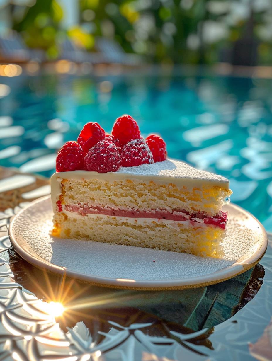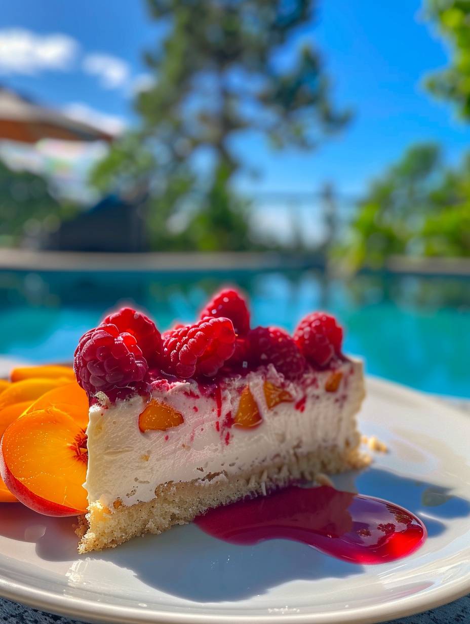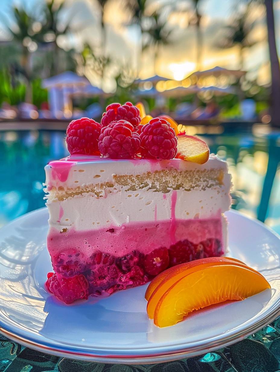 amateur closeup photo from instagram. taken with an iphone 15 pro. Mouthwatering delicious Peach Raspberry Cake featuring vibrant colors, served in luxury pool's ressort. --ar 3:4 --style raw --v 6.0