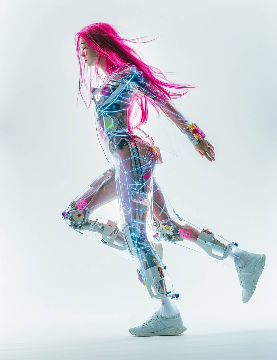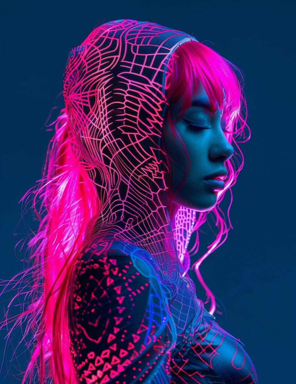 Futuristic Fashionista, Full Body Portrait, Taken with Sony Alpha 1, In a highly detailed photo, a stunning young woman with hot pink hair showcases a translucent tight bodysuit with intricate Retro Futurist Dadaism geometric patterns. The sharpness of the image highlights the intricate details and translucent surfaces of her outfit. Her dynamic pose and the futuristic patterns make her look like a vision from a sci-fi utopia. --ar 17:22 --style raw --v 6.0