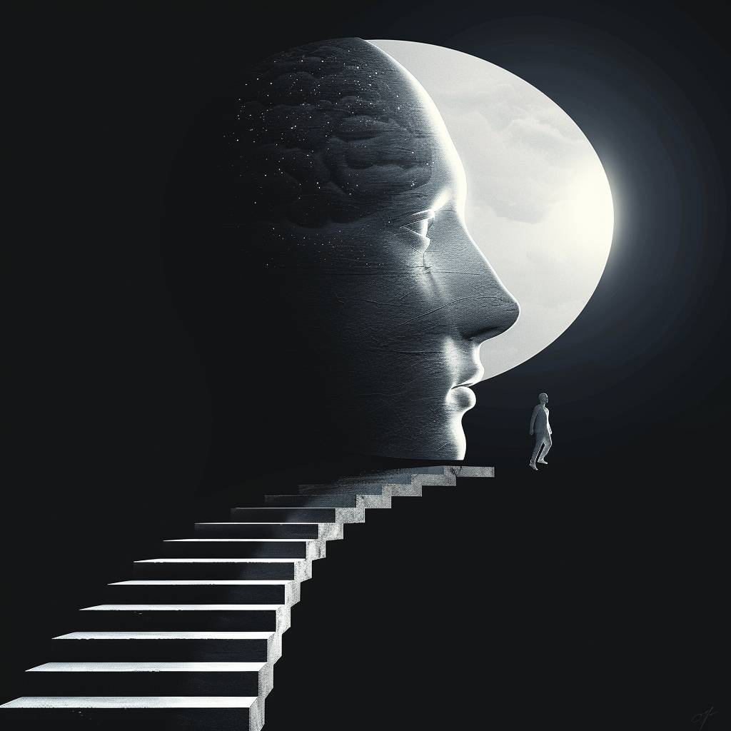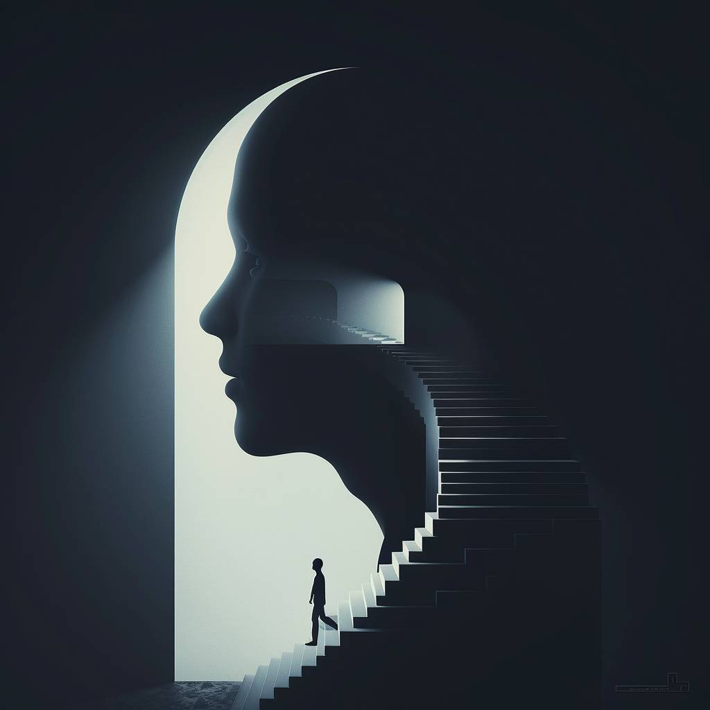 Create a digital artwork featuring a sculptural silhouette of [SUBJECT] head with an open mind revealing stairs inside. A lone figure is seen ascending the stairs, symbolizing personal growth. The scene is set against a stark black background with minimalistic design elements. Illuminate the piece with a [COLOR-white gradient ] lighting for a surreal effect. Ensure the artwork is in sharp focus, with a surreal, ethereal atmosphere. --v 6.0