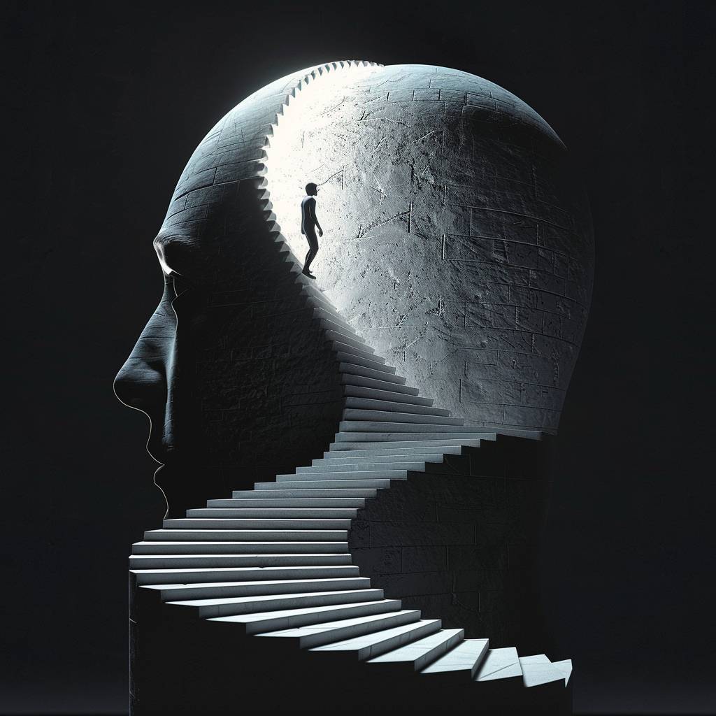 Crie uma obra de arte digital apresentando uma silhueta esculpida de uma cabeça com uma mente aberta revelando escadas dentro. Uma figura solitária é vista subindo as escadas, simbolizando o crescimento pessoal. A cena está definida contra um fundo preto intenso com elementos de design minimalistas. Ilumine a peça com uma iluminação em gradiente branco para um efeito surreal. Certifique-se de que a obra está em foco nítido, com uma atmosfera surreal e etérea.