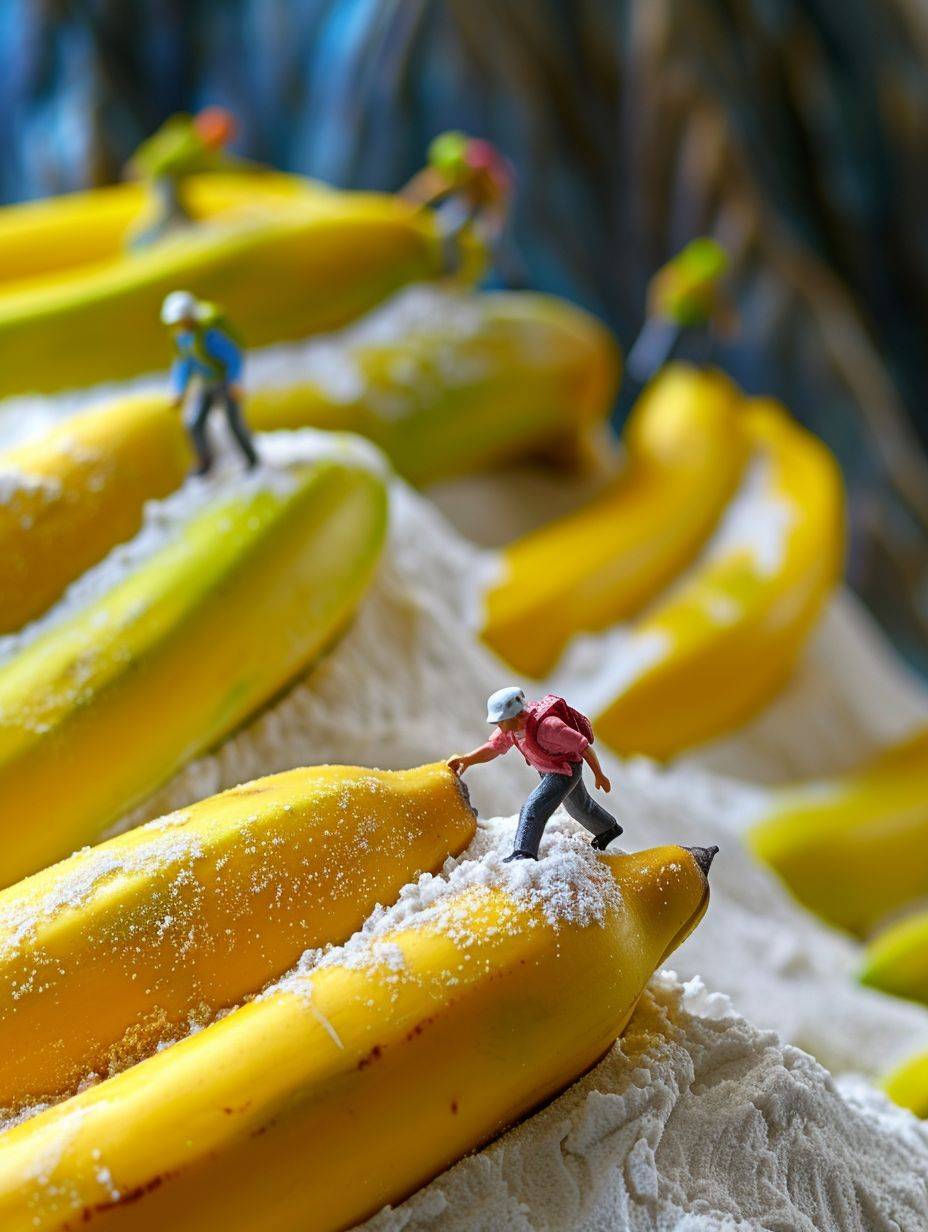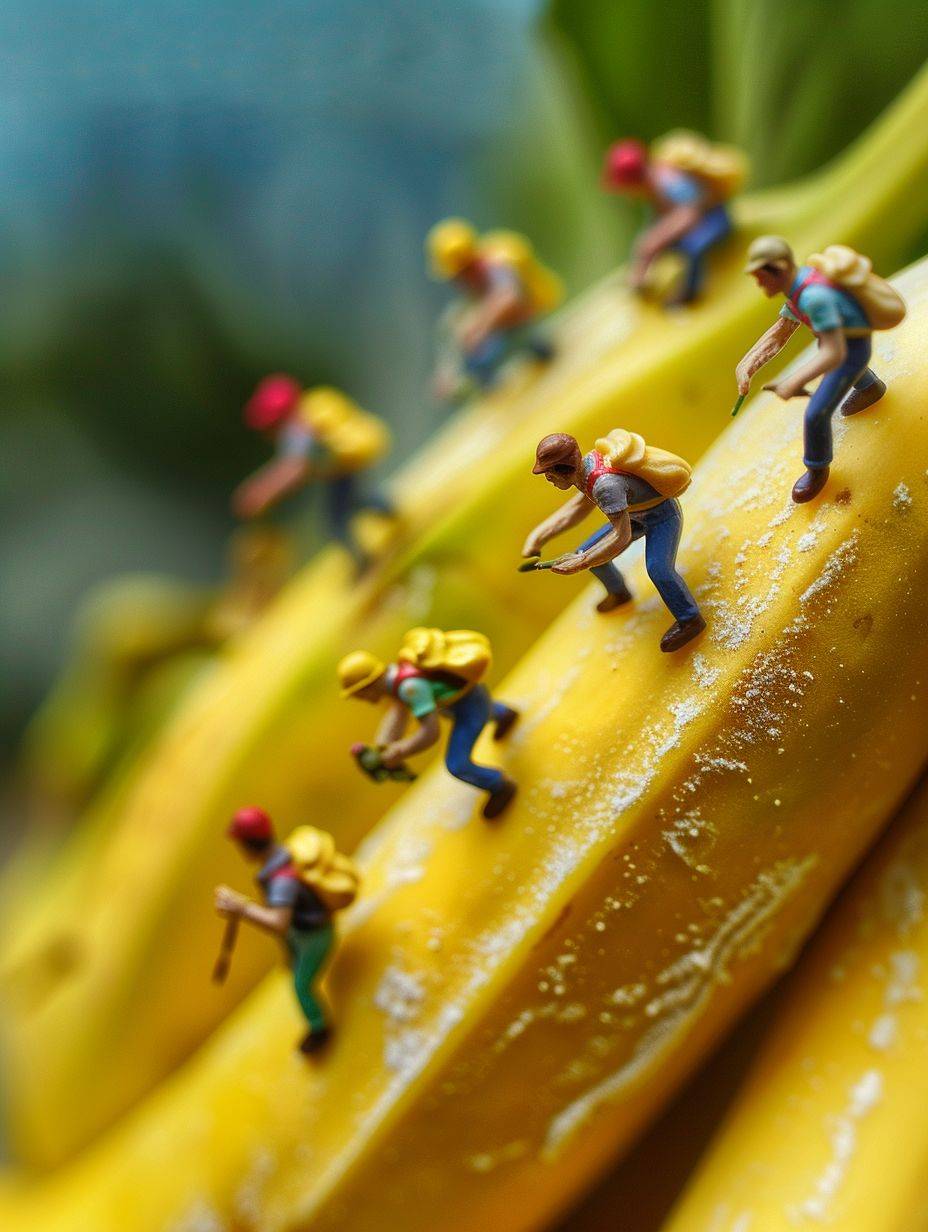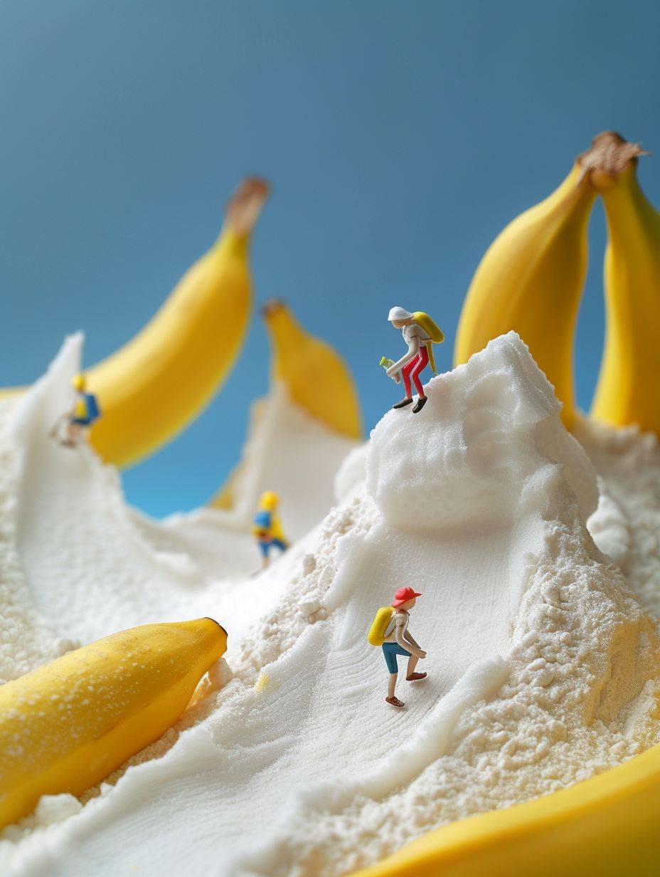 little people climb the banana mountains,roads made of flour , miniatures, porters, games, fantasy landscape style, macro art, miniature cores, highly creative images, miniature creative photography, colorful animated stills, grocery art, minimalist figures, kawaii punk, advertising posters --ar 3:4 --v 6