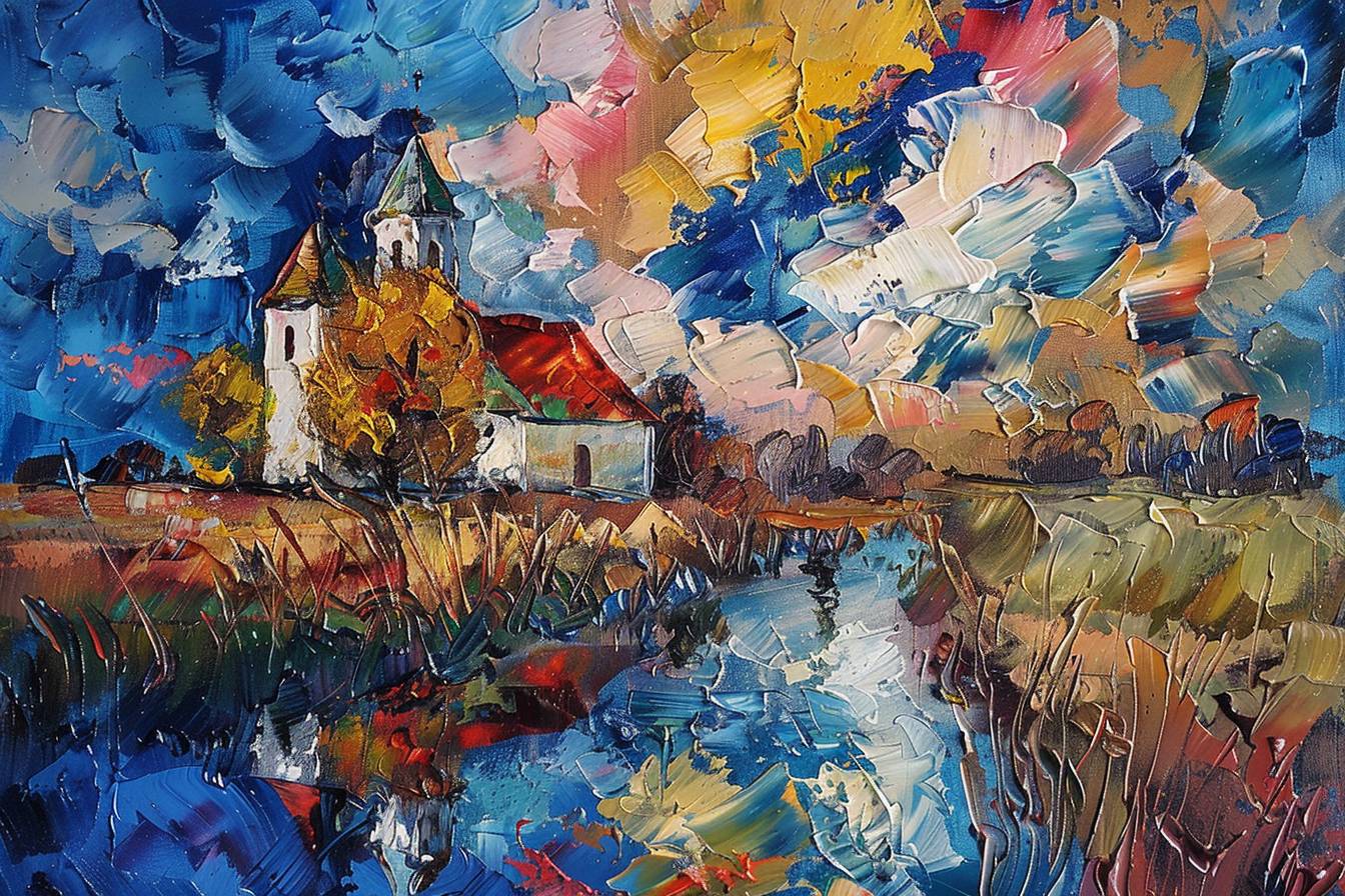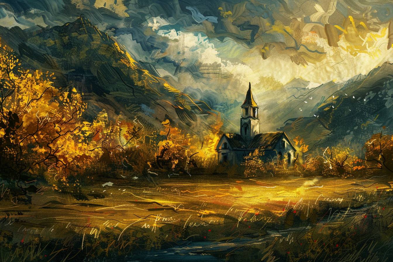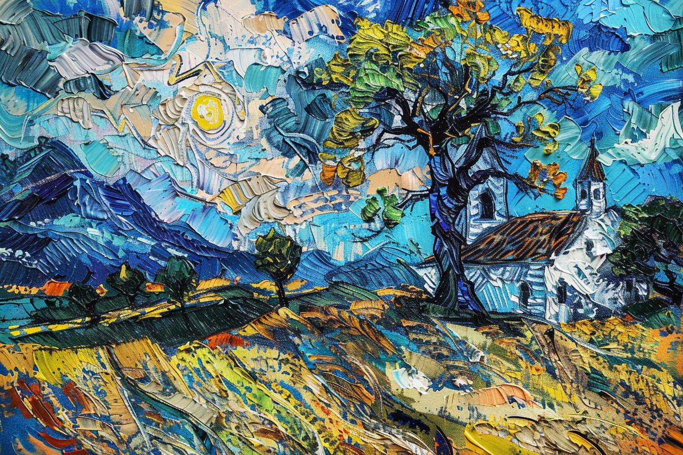 Paisagem natural e igreja no estilo de Vincent van Gogh