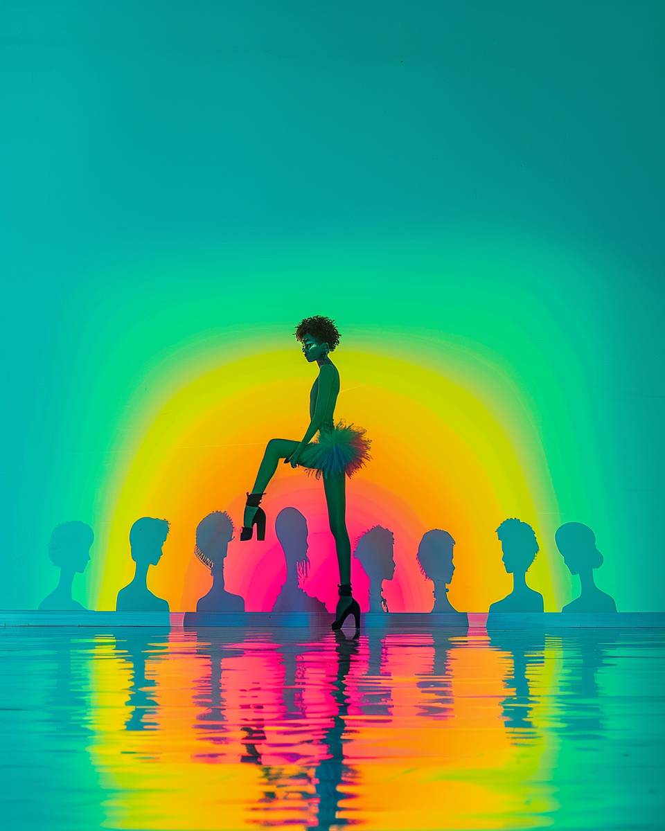 Sombras de néon, silhuetas de moda cativantes.