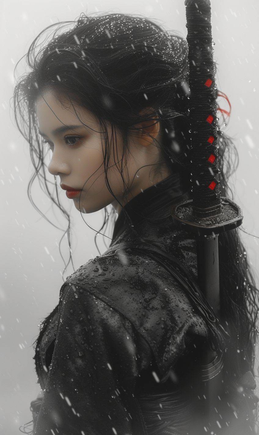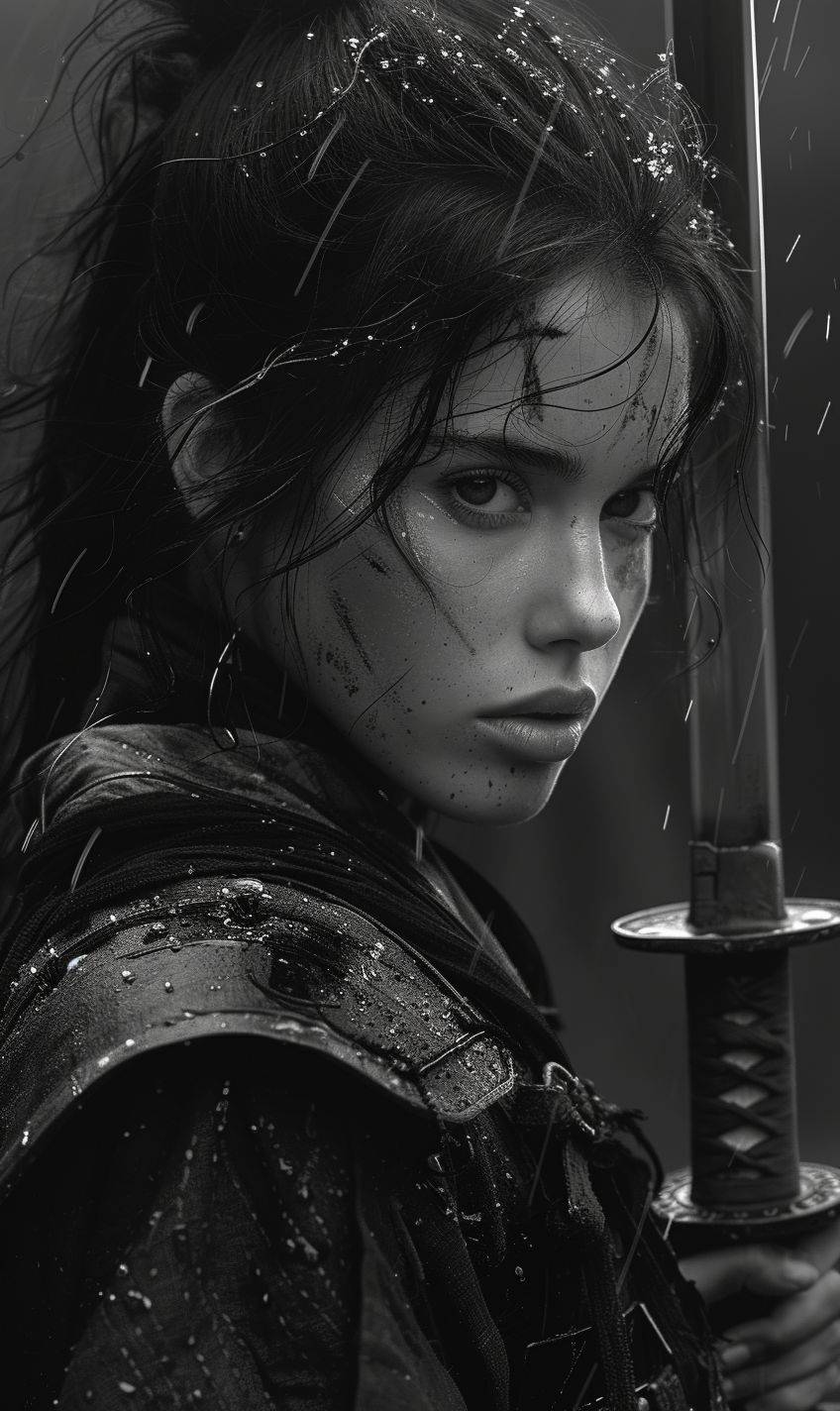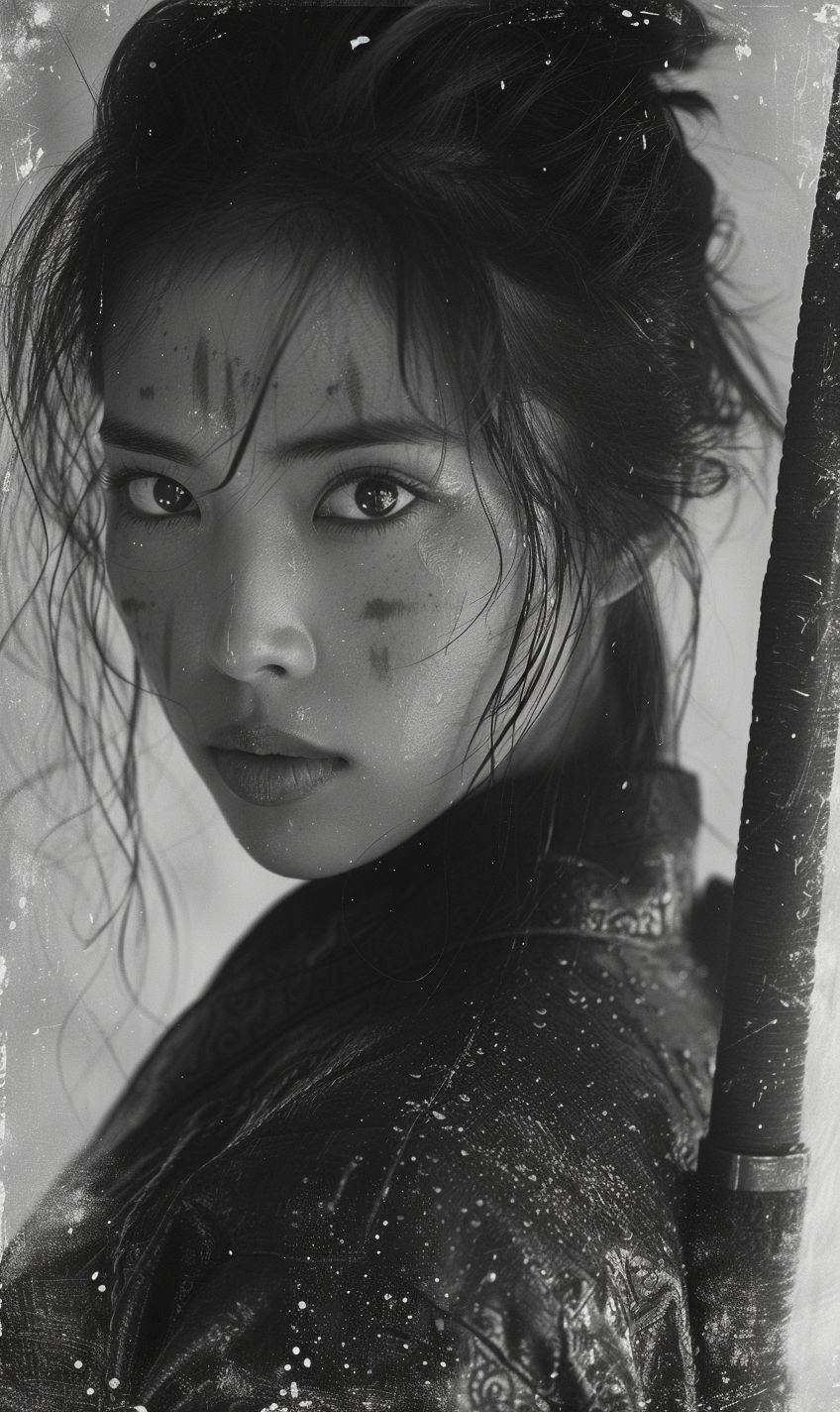 samurai girl, in the style of black and white realism, atmospheric impressionism, darkly romantic realism, pre-raphaelite realism, grainy, black and white photos, soft-focused realism --ar 36:61 --v 6 --stylize 750